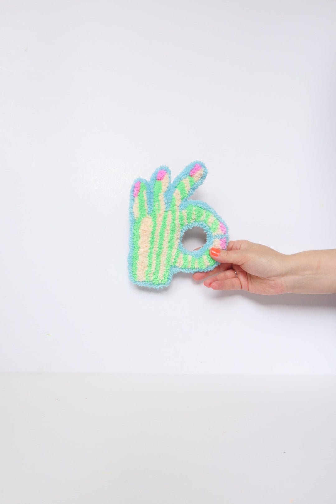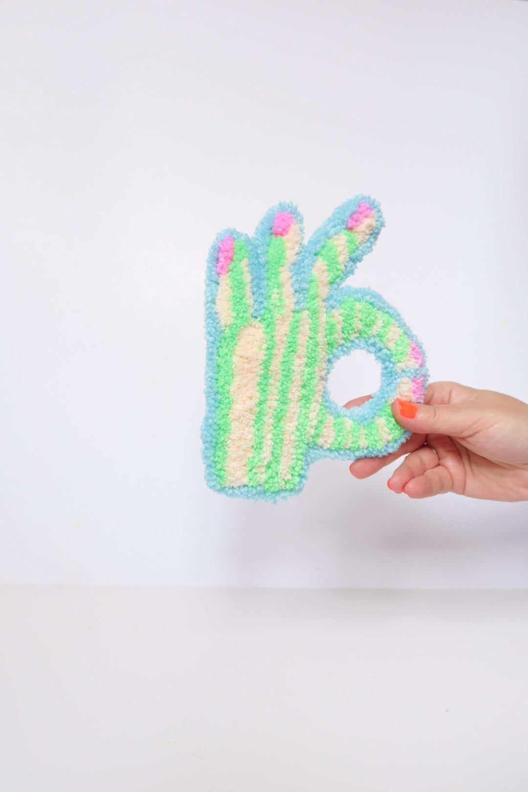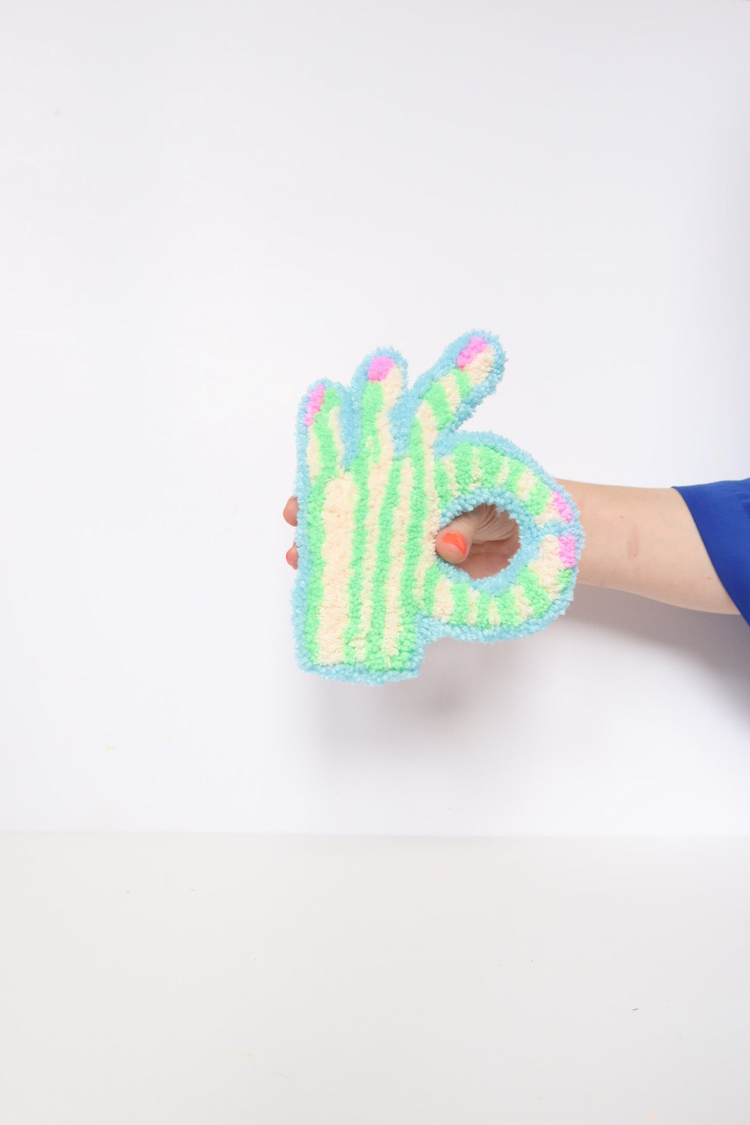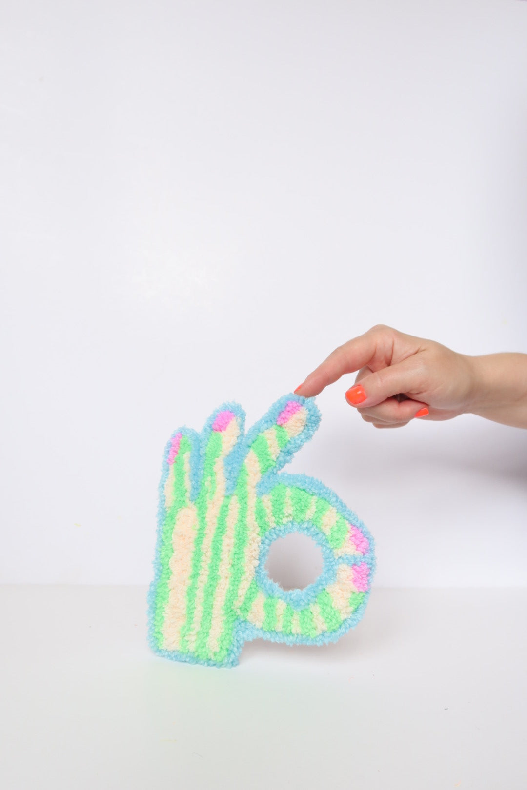 Denne håndlavede OK-hånd i mint og lyserød er et opmuntrende og positivt kunstværk der minder dig om at alt bliver godt. Med sit optimistiske budskab spreder den håb og positive vibes i dit hjem.
