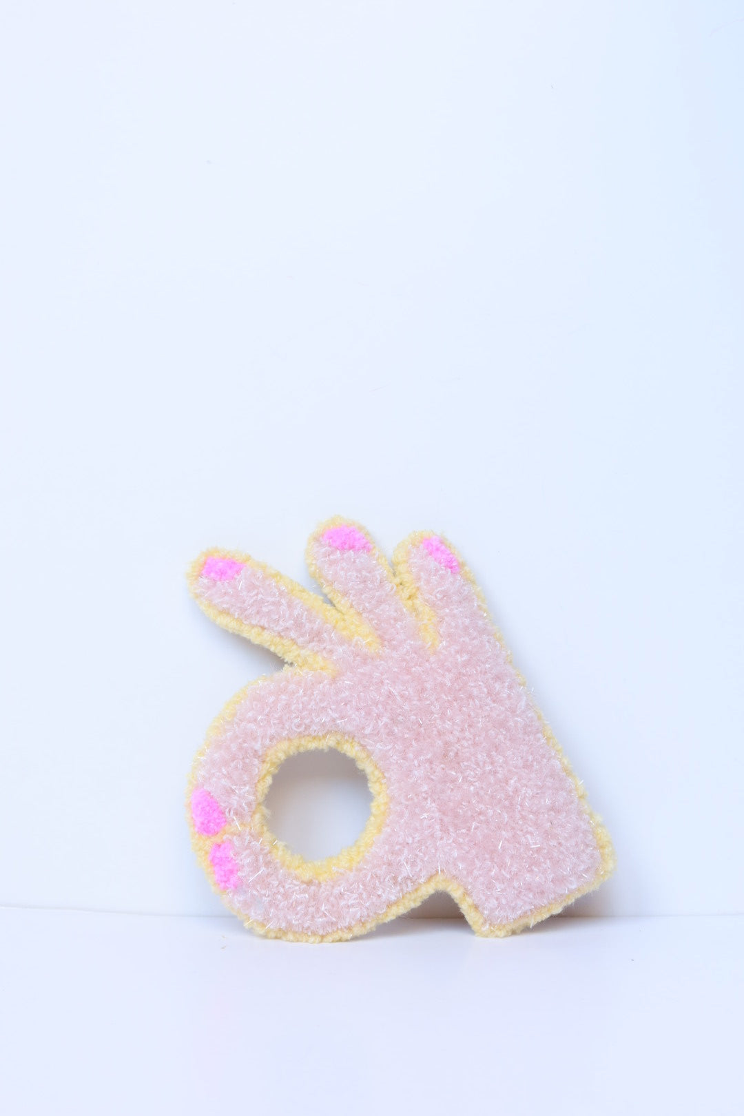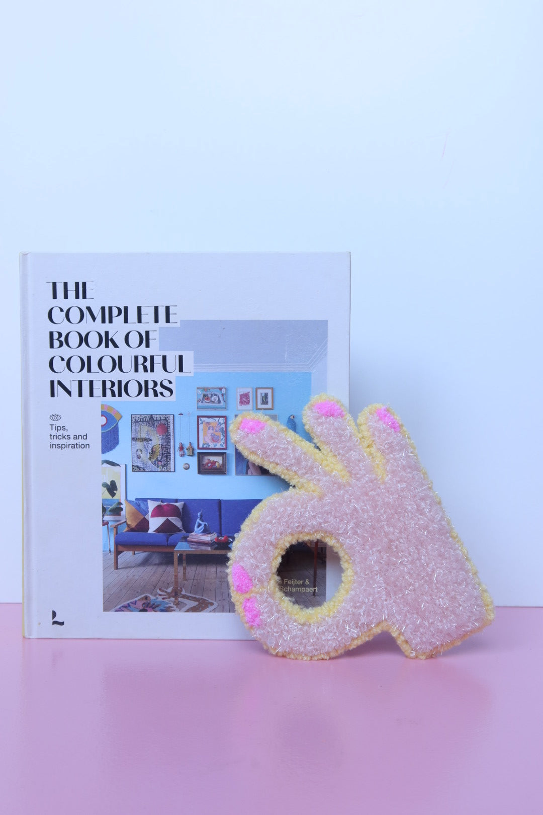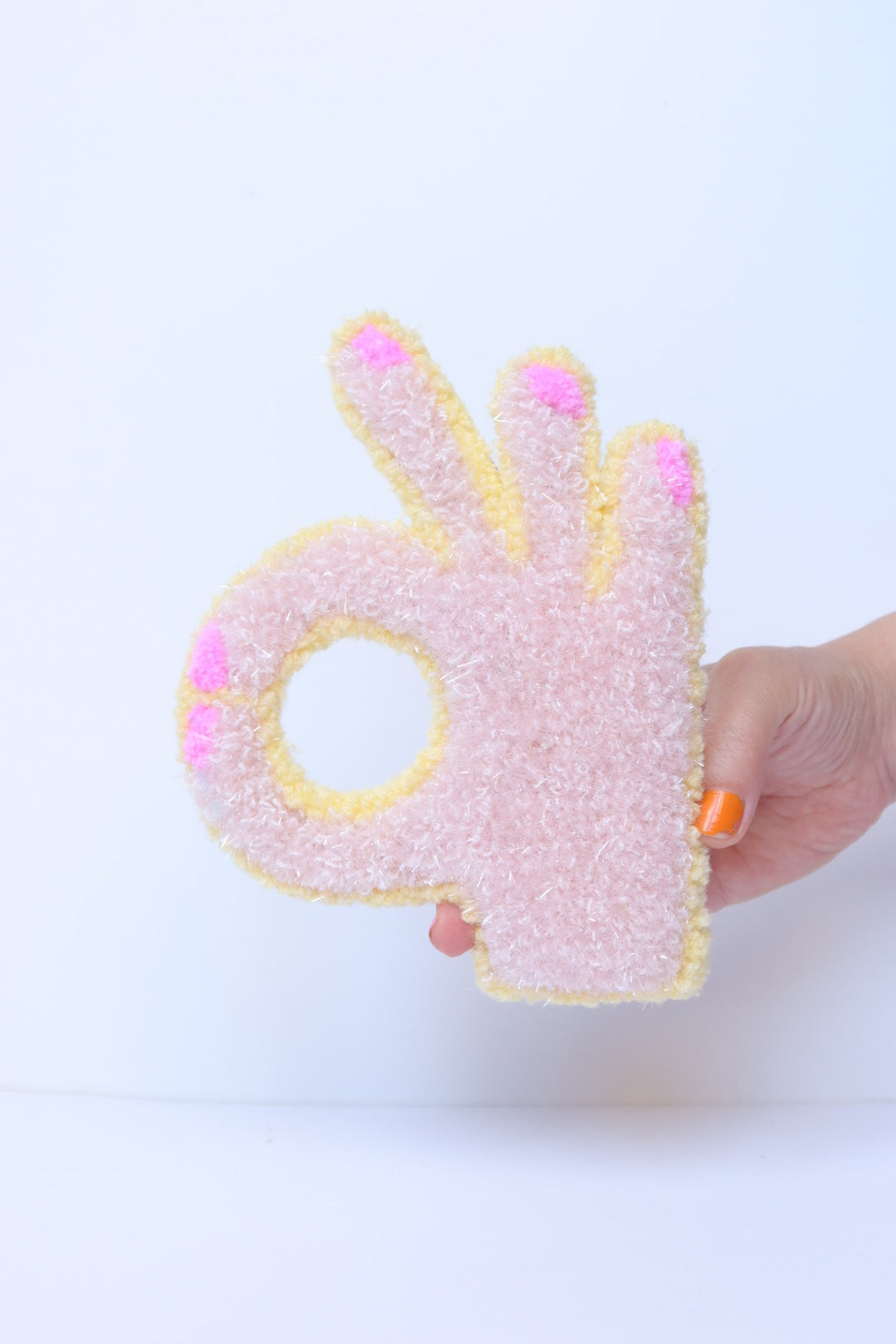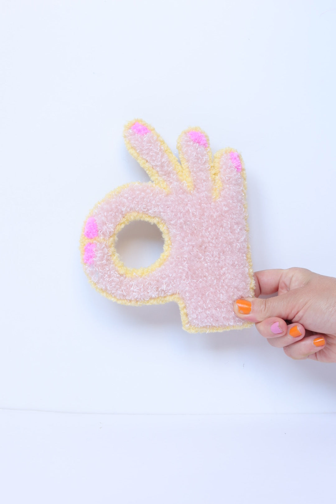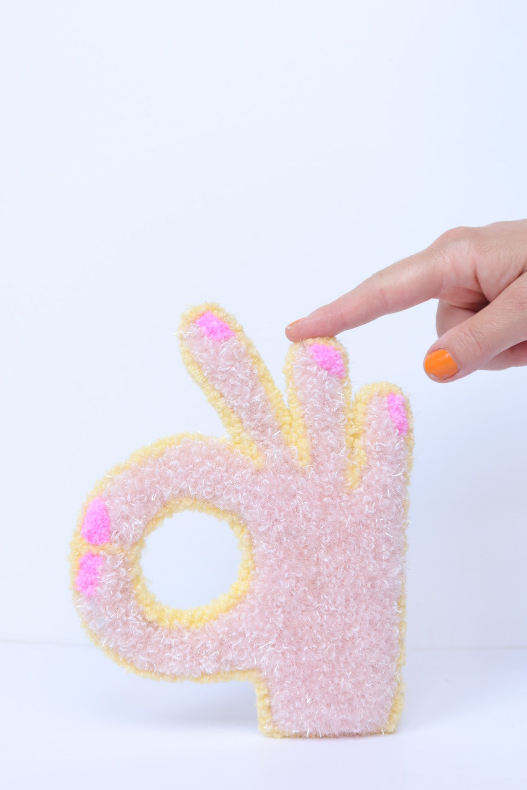 Denne håndlavede OK-hånd i soft pink og gul er et opmuntrende og positivt kunstværk der minder dig om at alt bliver godt. Med sit optimistiske budskab spreder den håb og positive vibes i dit hjem.