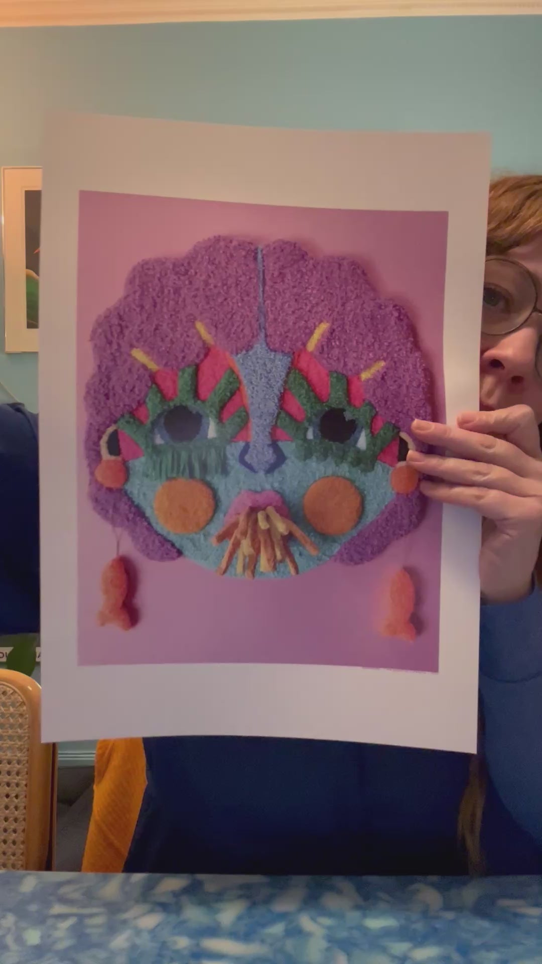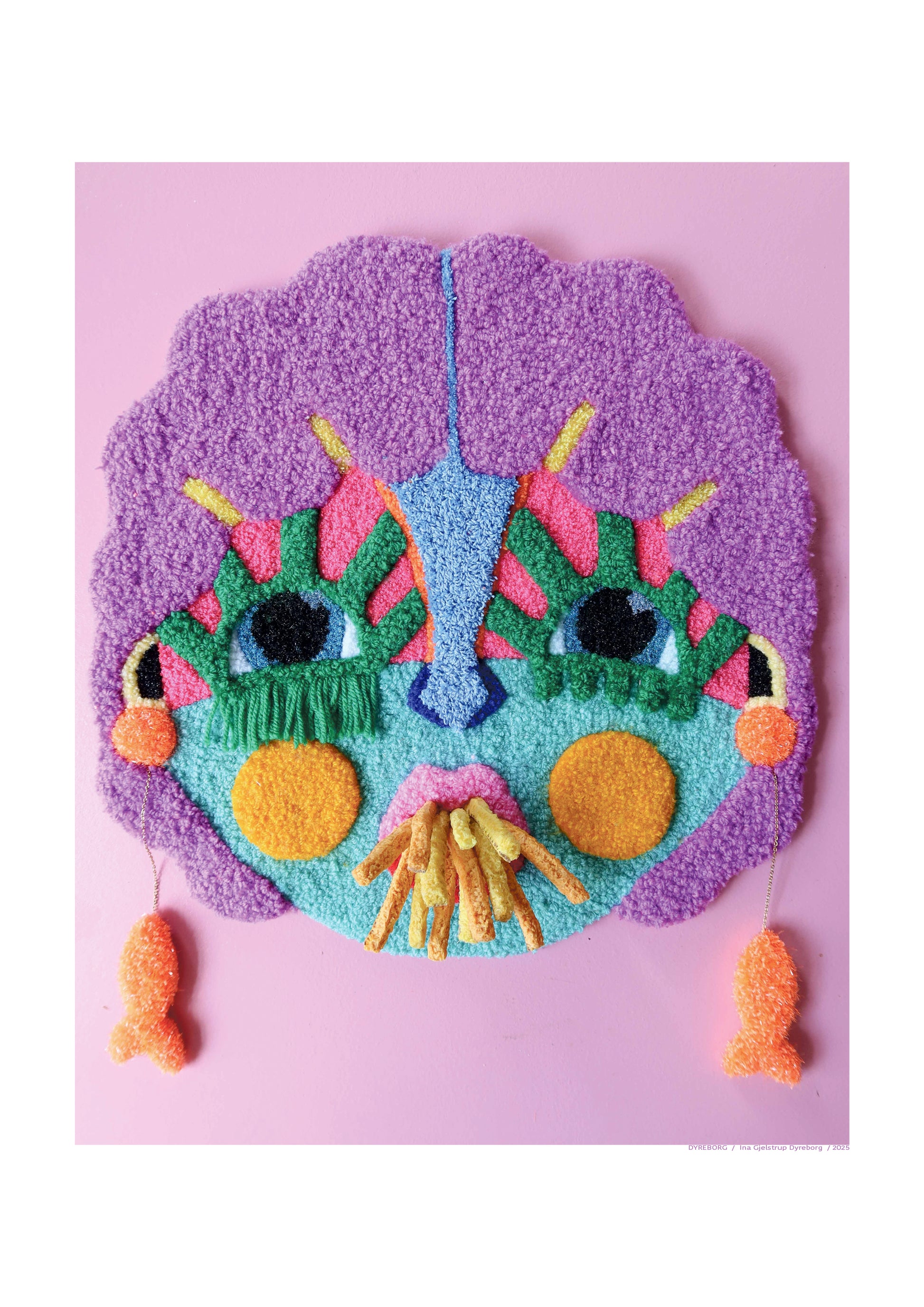 Plakat af mit håndlavede tuftede værk/maske Fish & Chips.