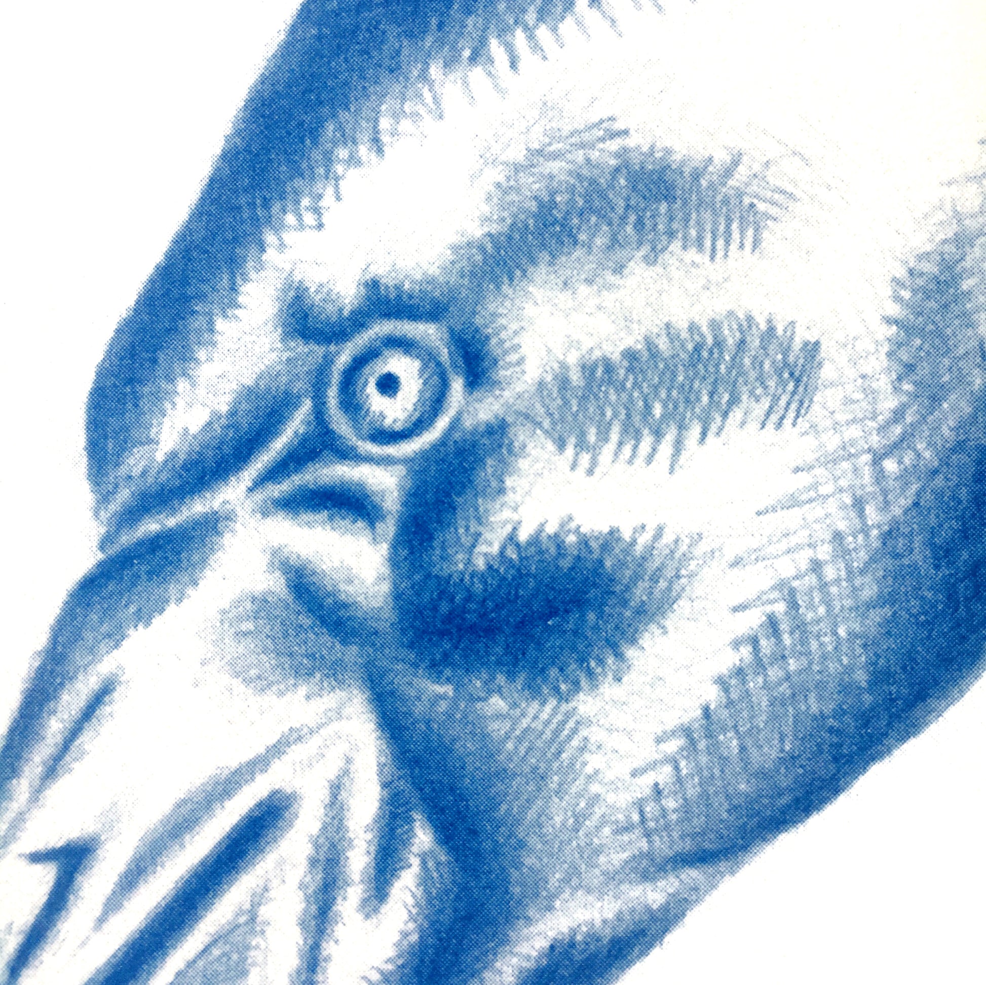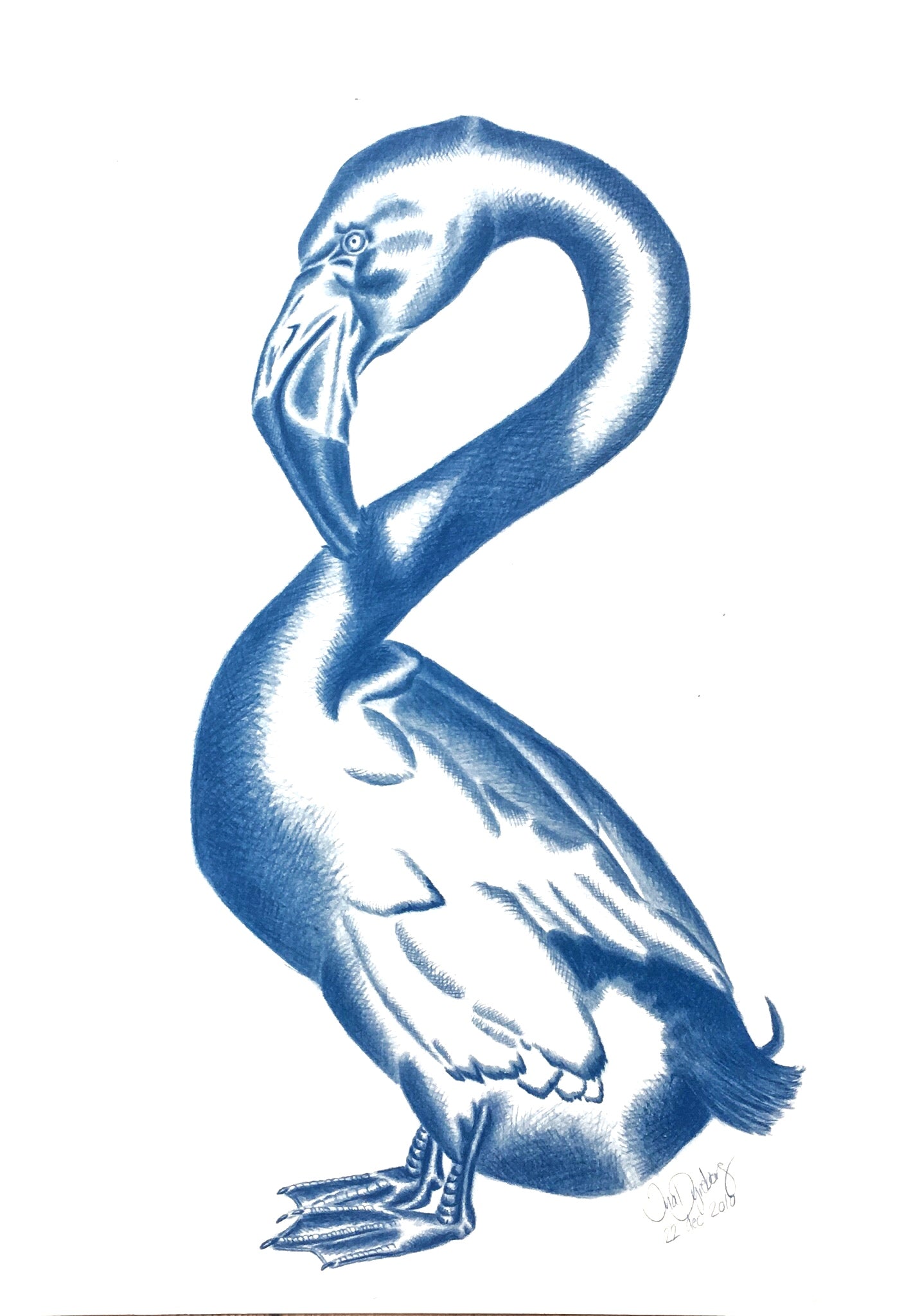 A3 tryk af flamingo & And tegnet med blå farveblyant.