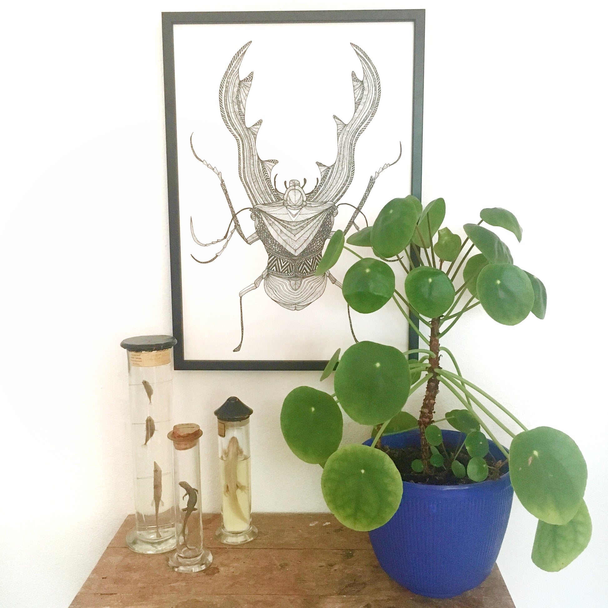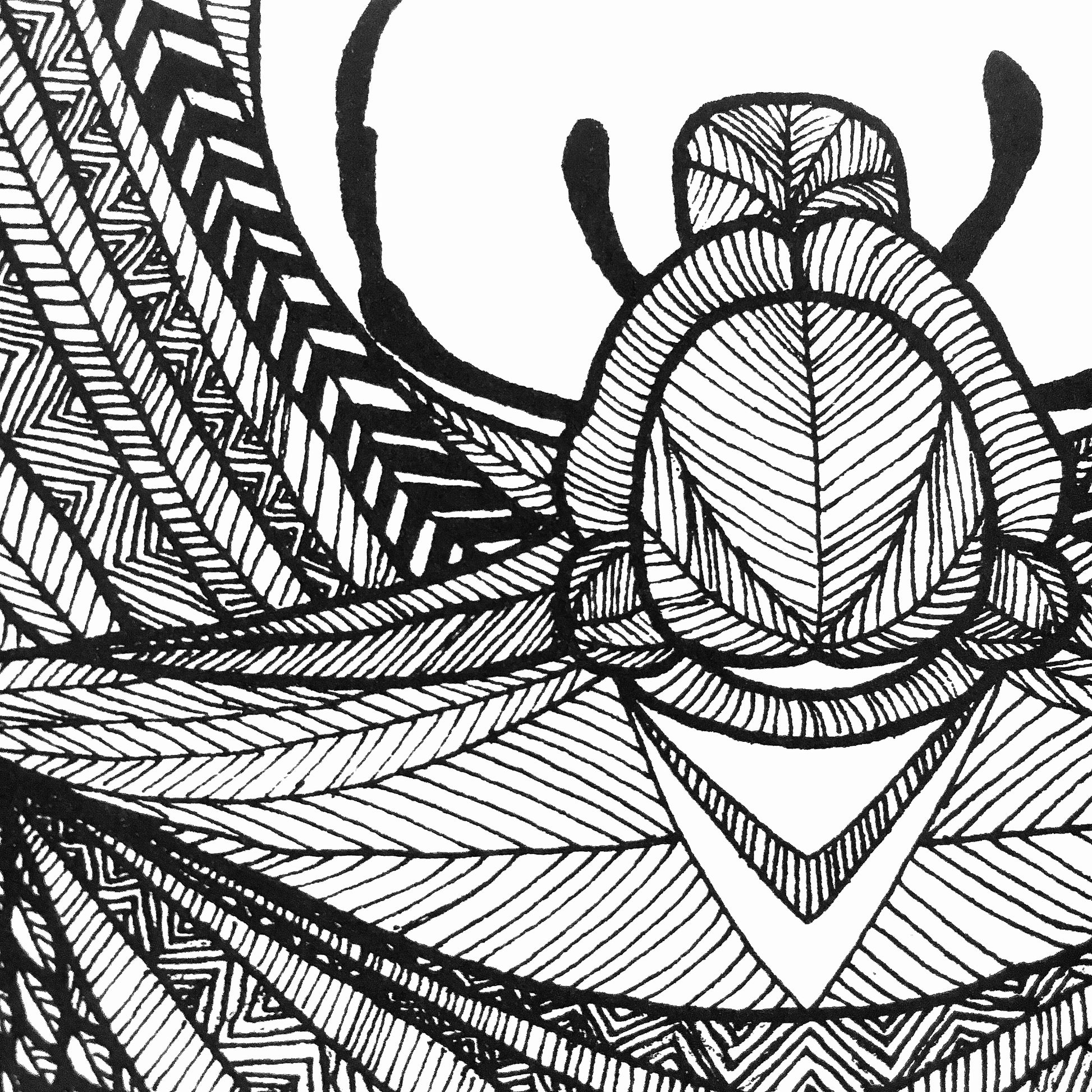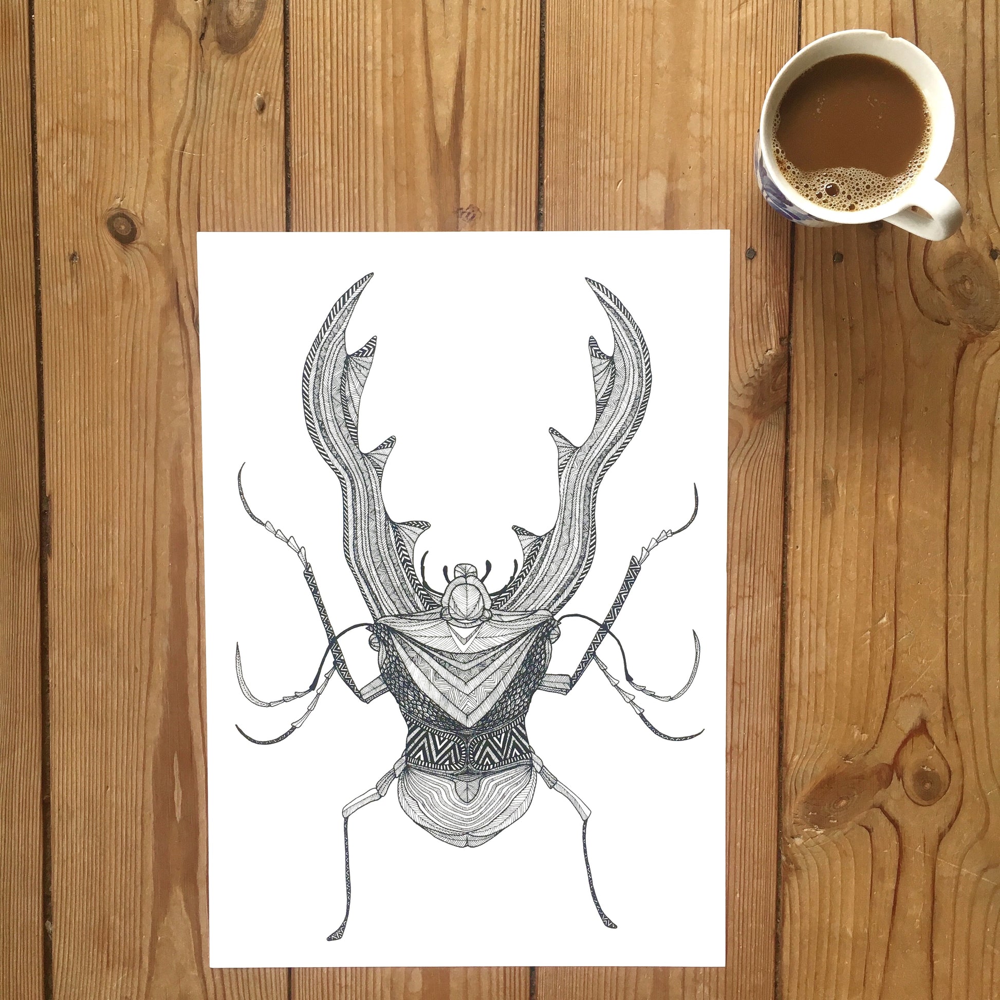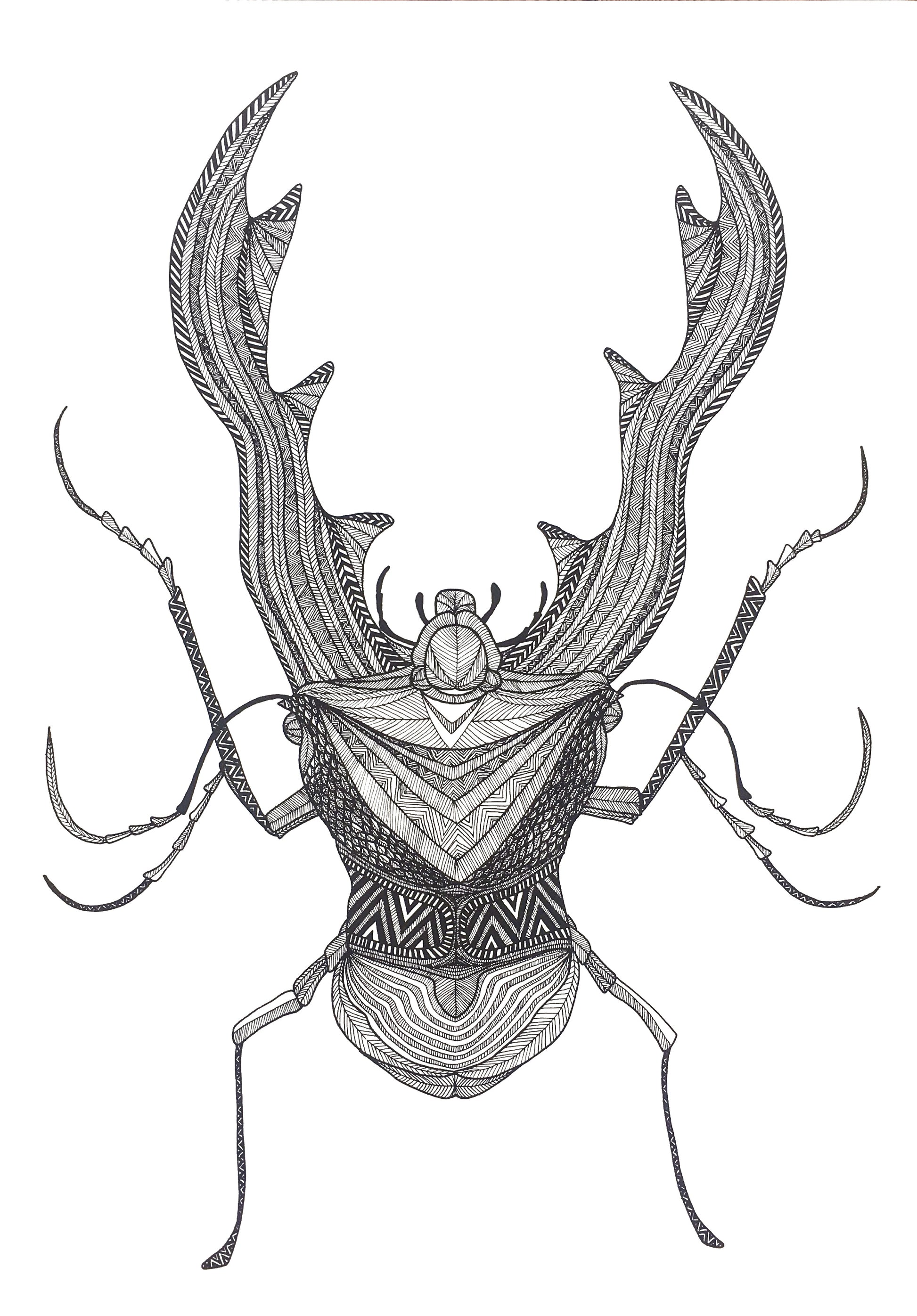 A3 tryk af hjortebille tegnet med sort fine liner.