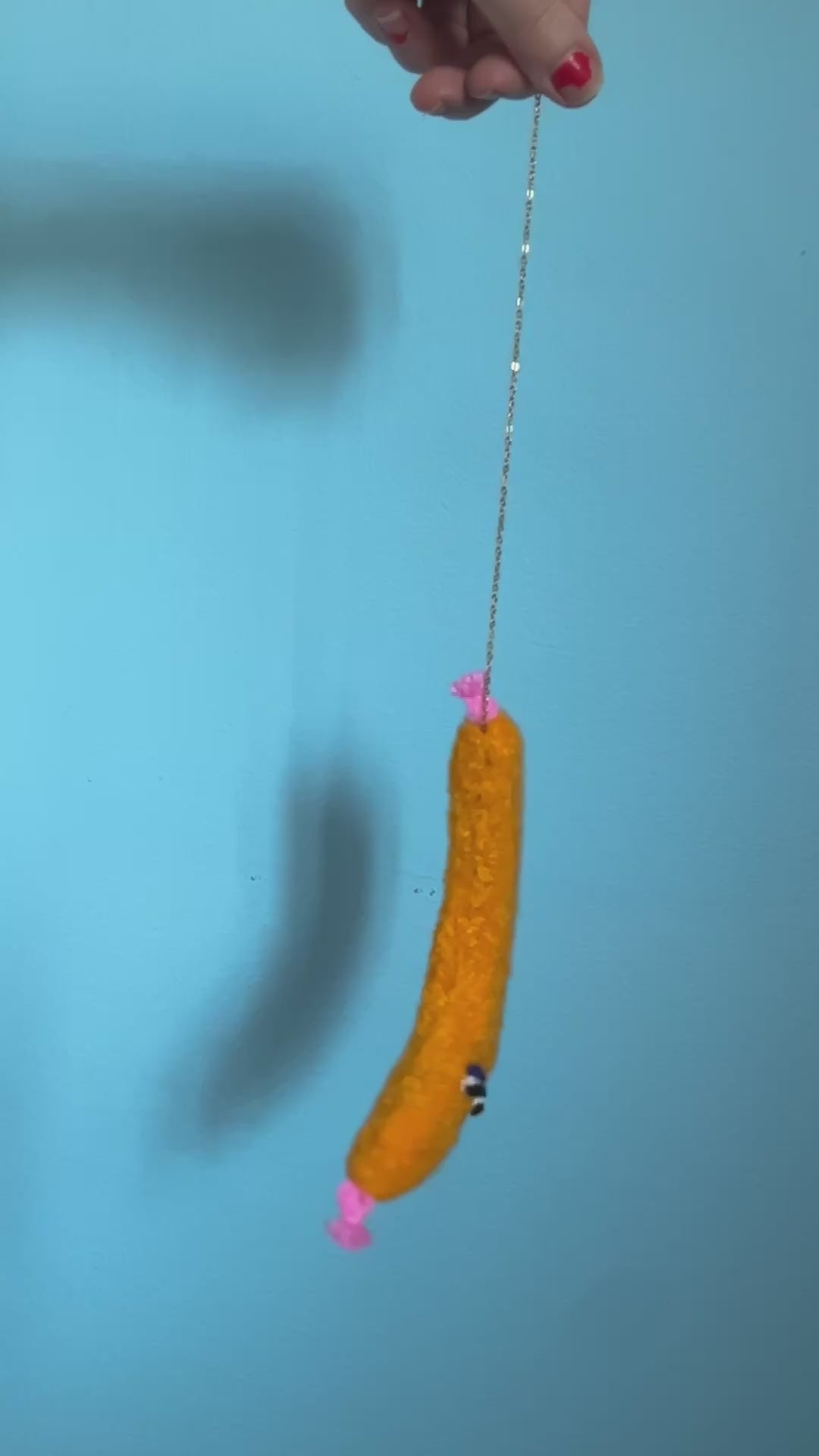 Denne lodne, gule pølse med øjne er et charmerende og humoristisk kunstværk der garanteret får folk til at smile. Med sin bløde, furry tekstur og personlige øjne har denne pølse sin helt egen karakter.