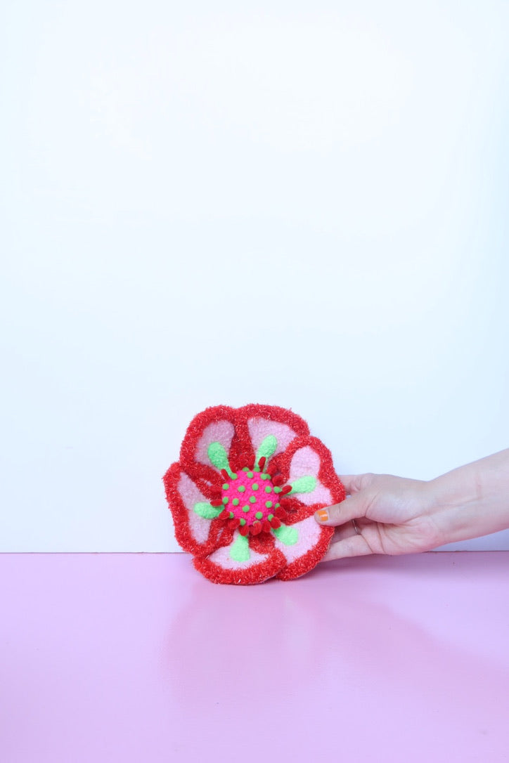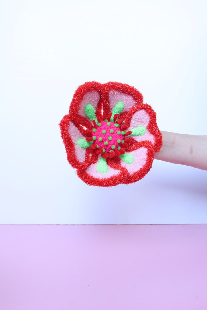Denne håndtuftede blomst i klassiske blomsterfarver er ikke bare kunst - den er interaktiv. Du kan forme den præcis som du vil have den, skabe din egen unikke blomst i lyserød, rød og grøn der passer til dit hjem og din stemning.