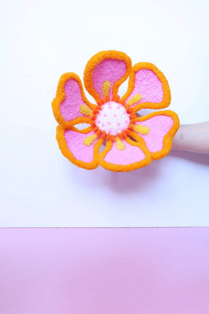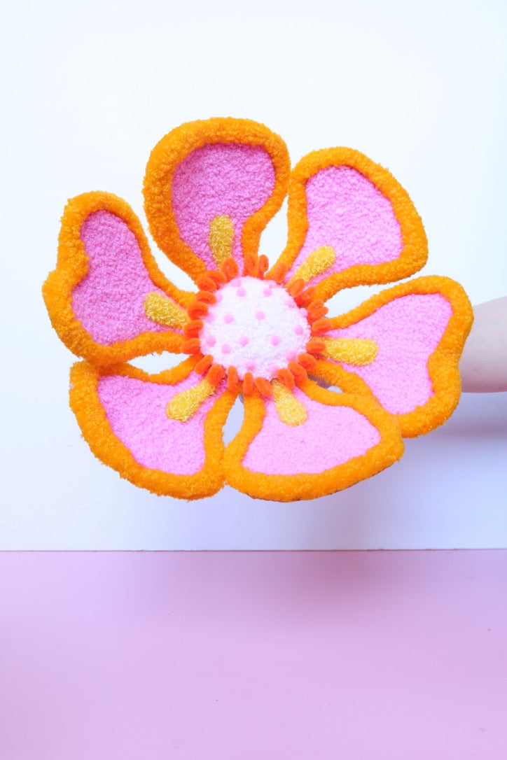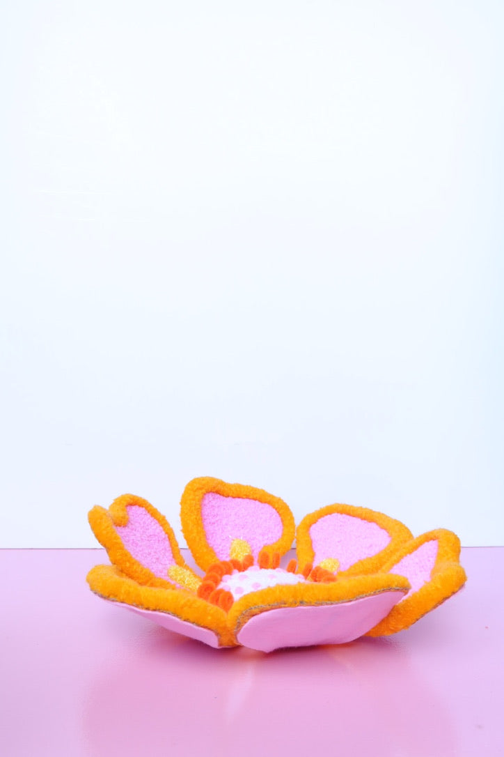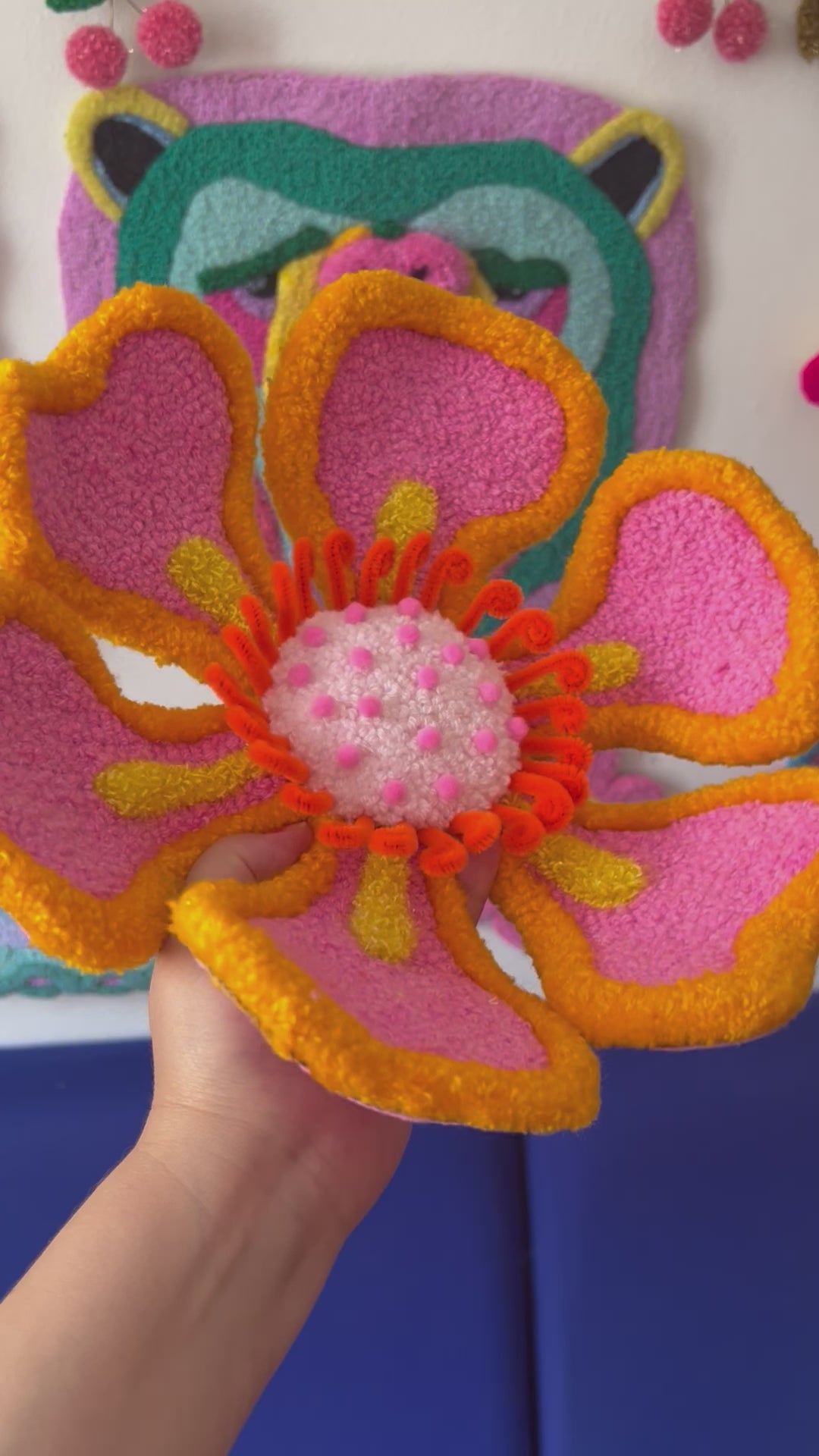 Denne håndtuftede blomst i varme, solrige farver er ikke bare kunst - den er interaktiv. Du kan forme den præcis som du vil have den, skabe din egen imponerende blomst i lyserød og gul der spreder glæde i dit hjem.