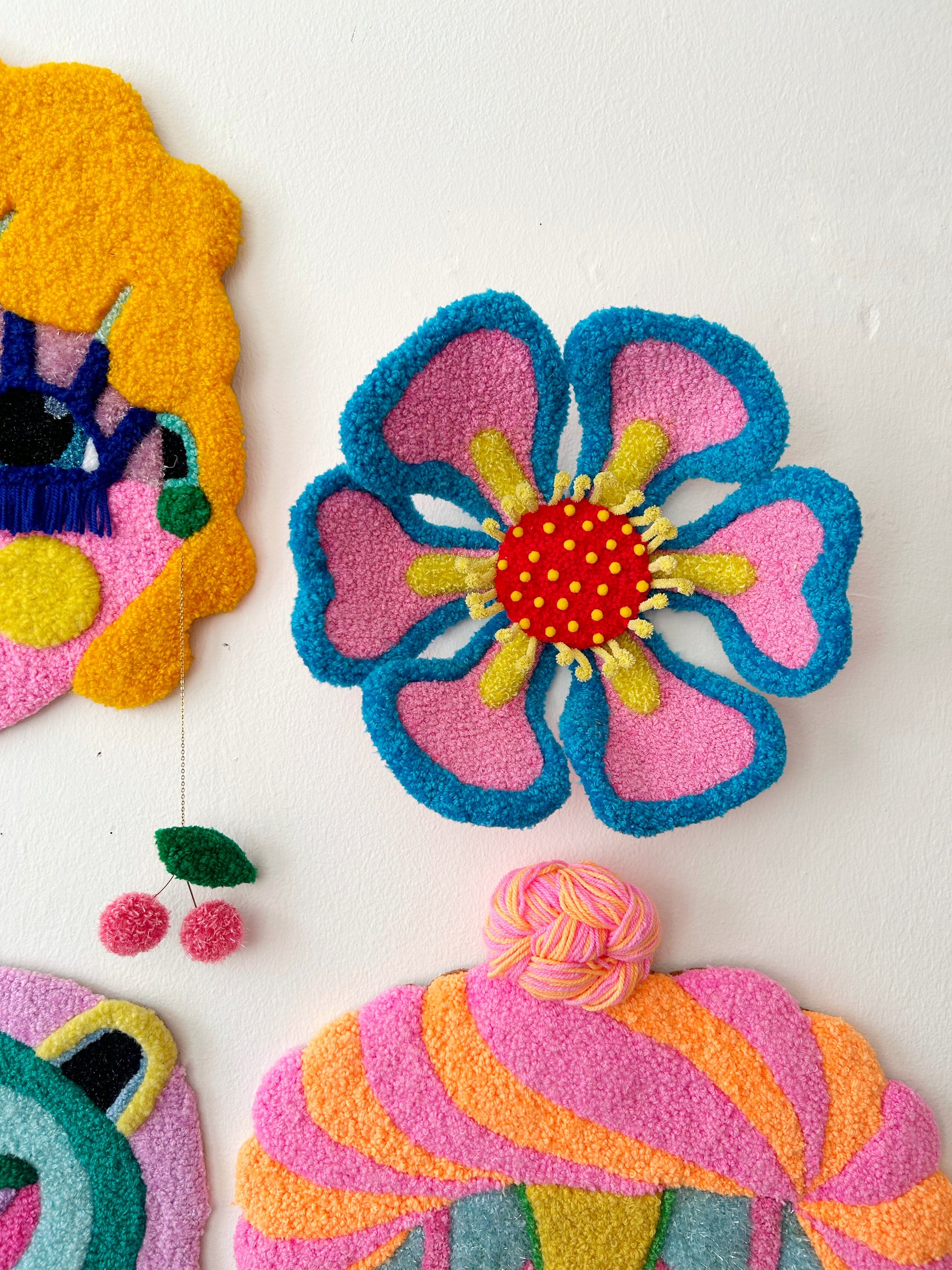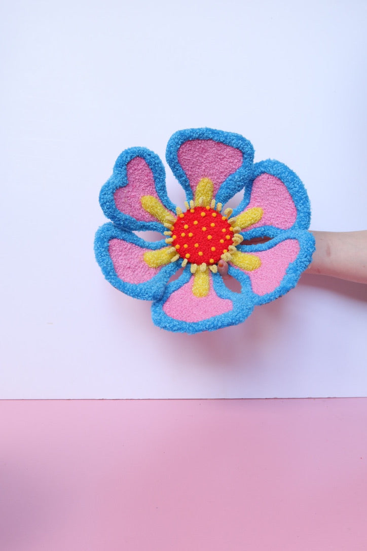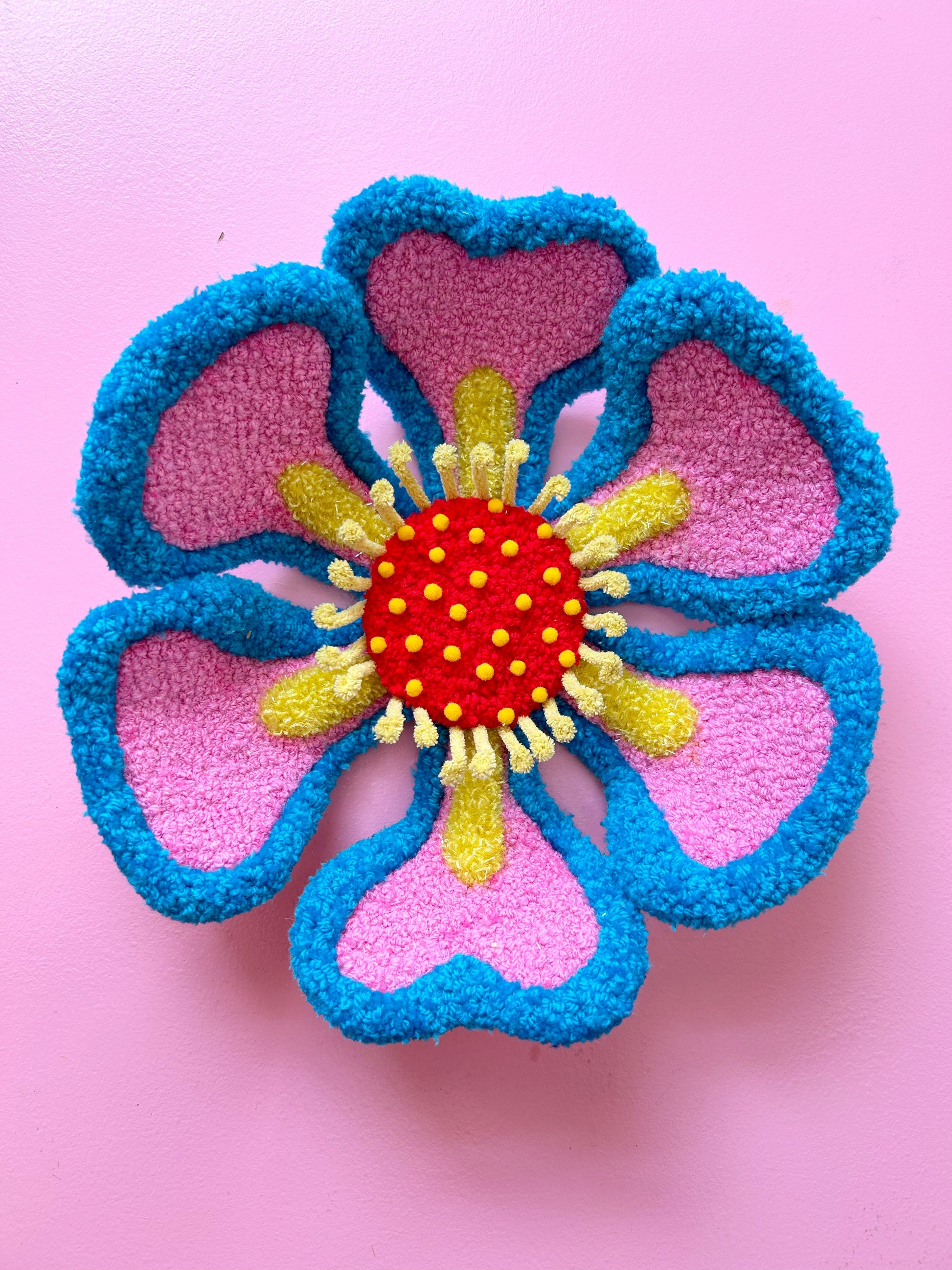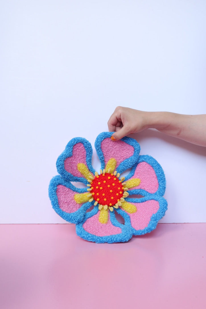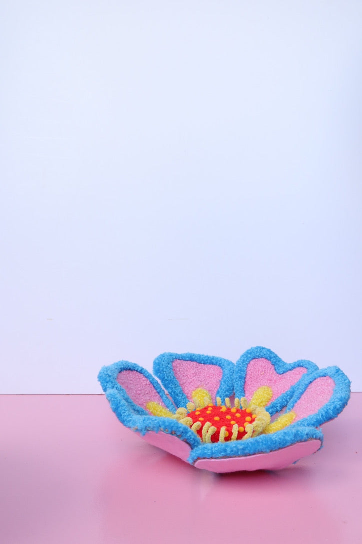 Denne håndtuftede blomst i livlige, kontrasterende farver er ikke bare kunst - den er interaktiv. Du kan forme den præcis som du vil have den, skabe din egen imponerende blomst i pink, blå og gul der tilføjer farve og energi til dit hjem.
