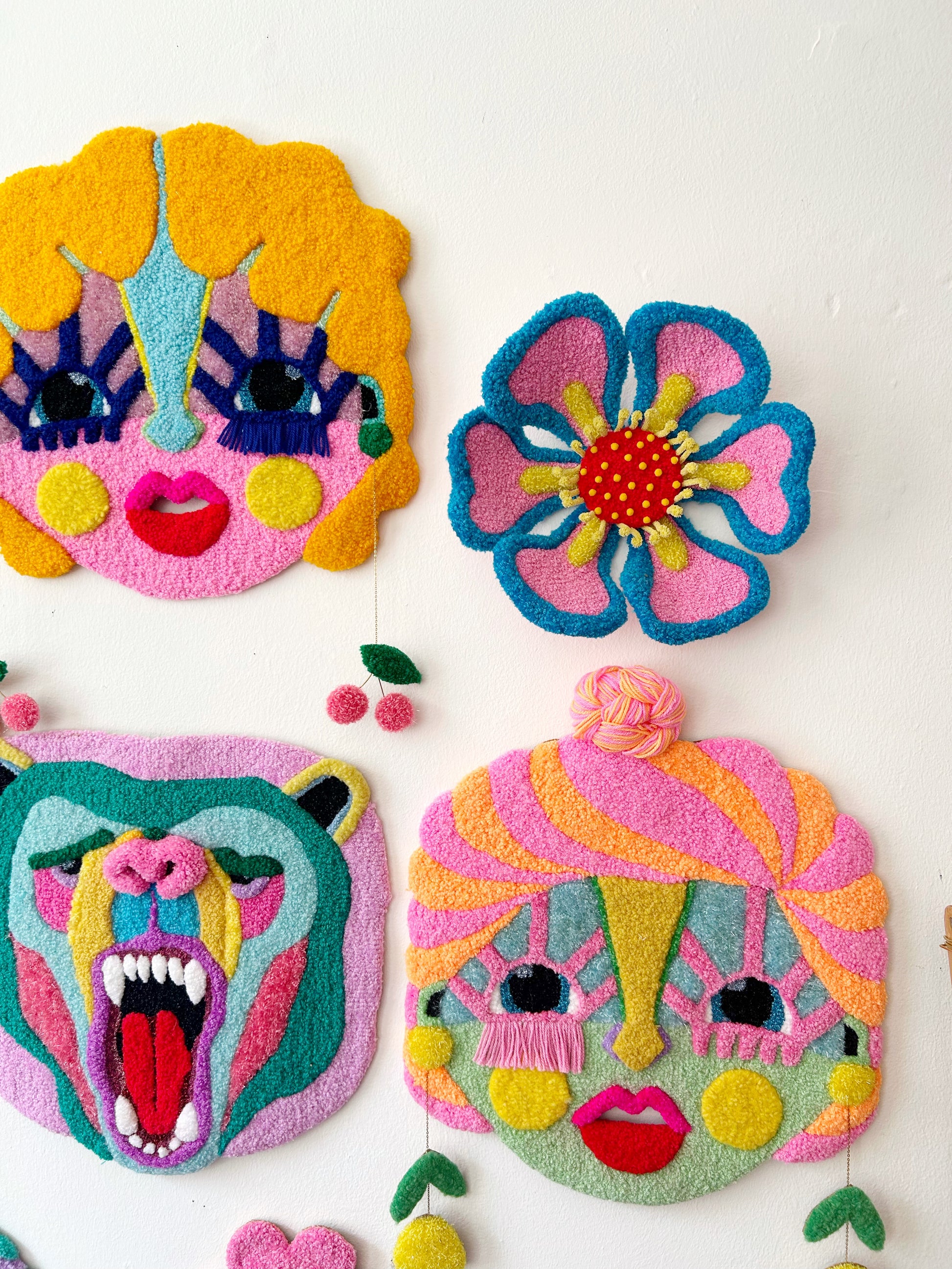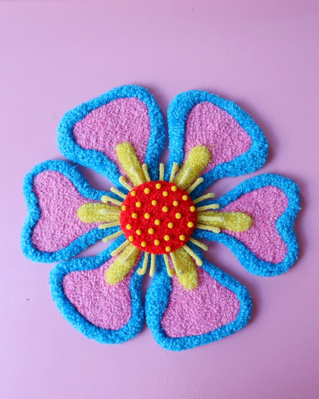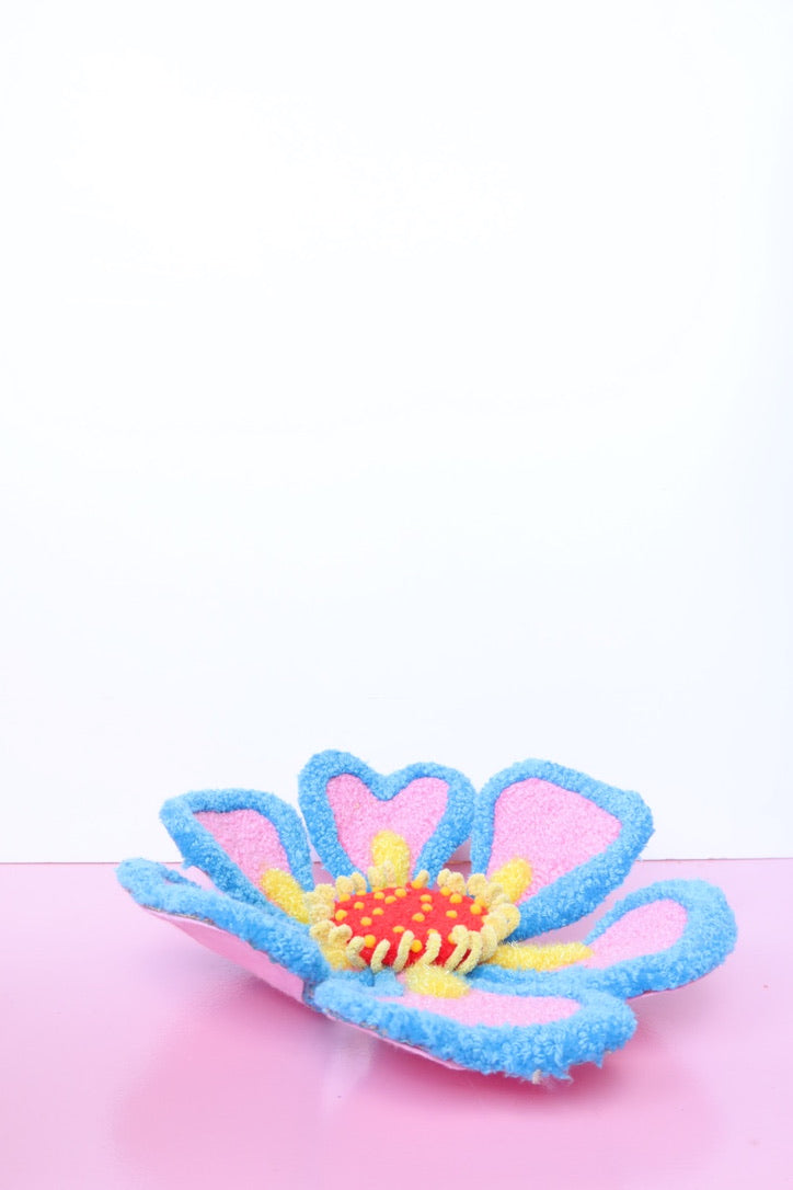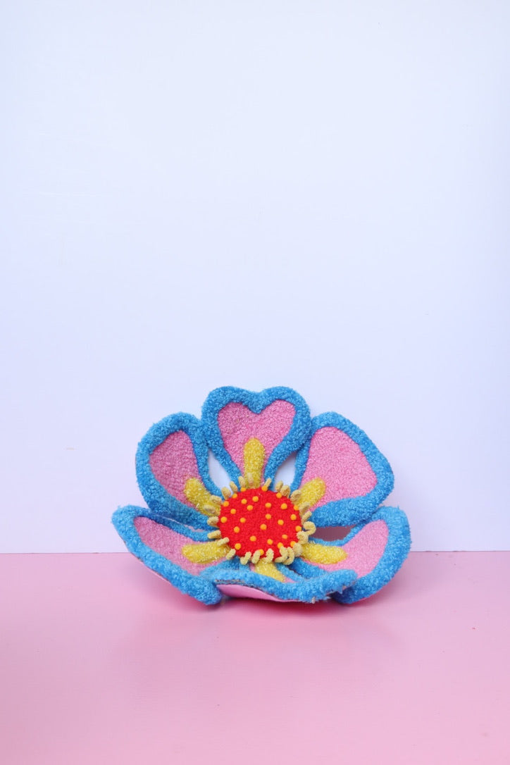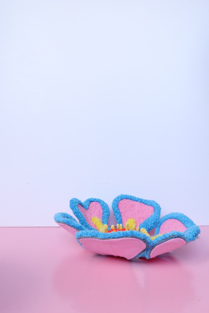 Denne håndtuftede blomst i livlige, kontrasterende farver er ikke bare kunst - den er interaktiv. Du kan forme den præcis som du vil have den, skabe din egen imponerende blomst i pink, blå og gul der tilføjer farve og energi til dit hjem.