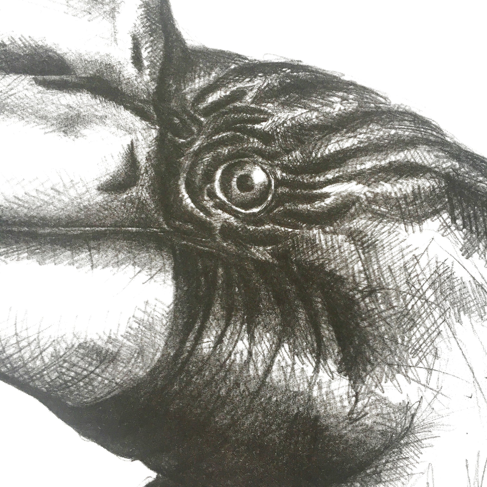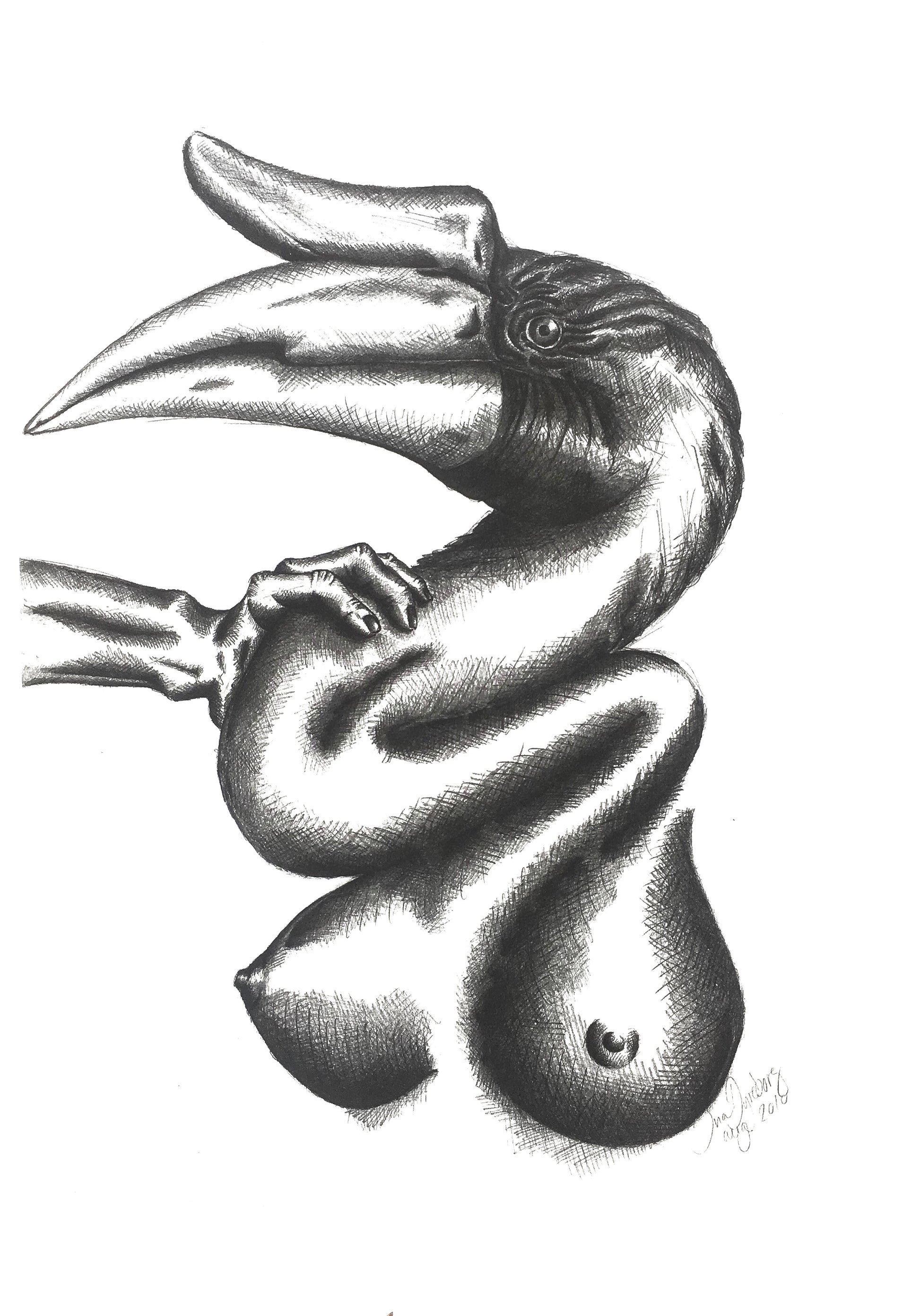 A3 tryk af Næsehornsfugl - metamorfe med bryster tegnet med blyant.