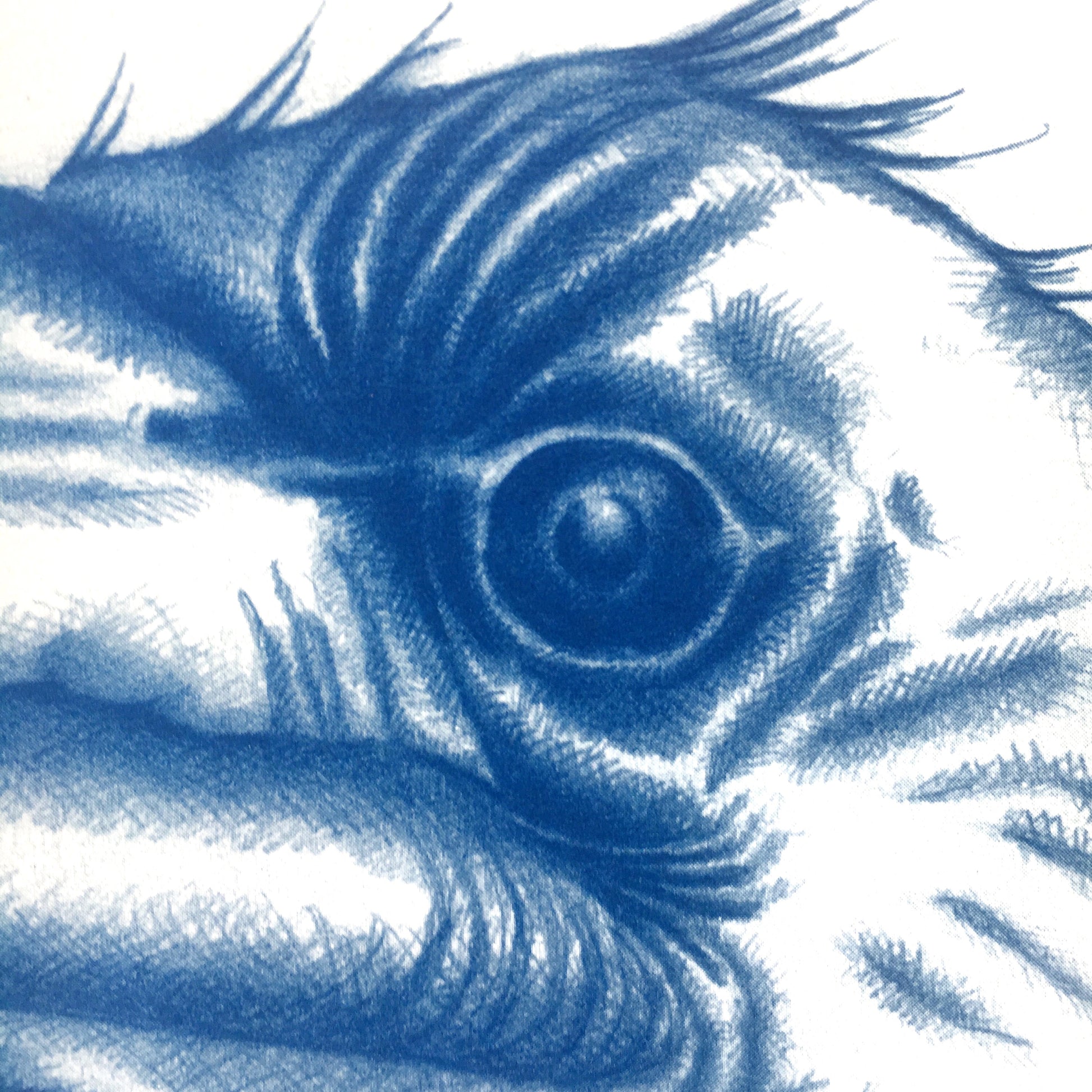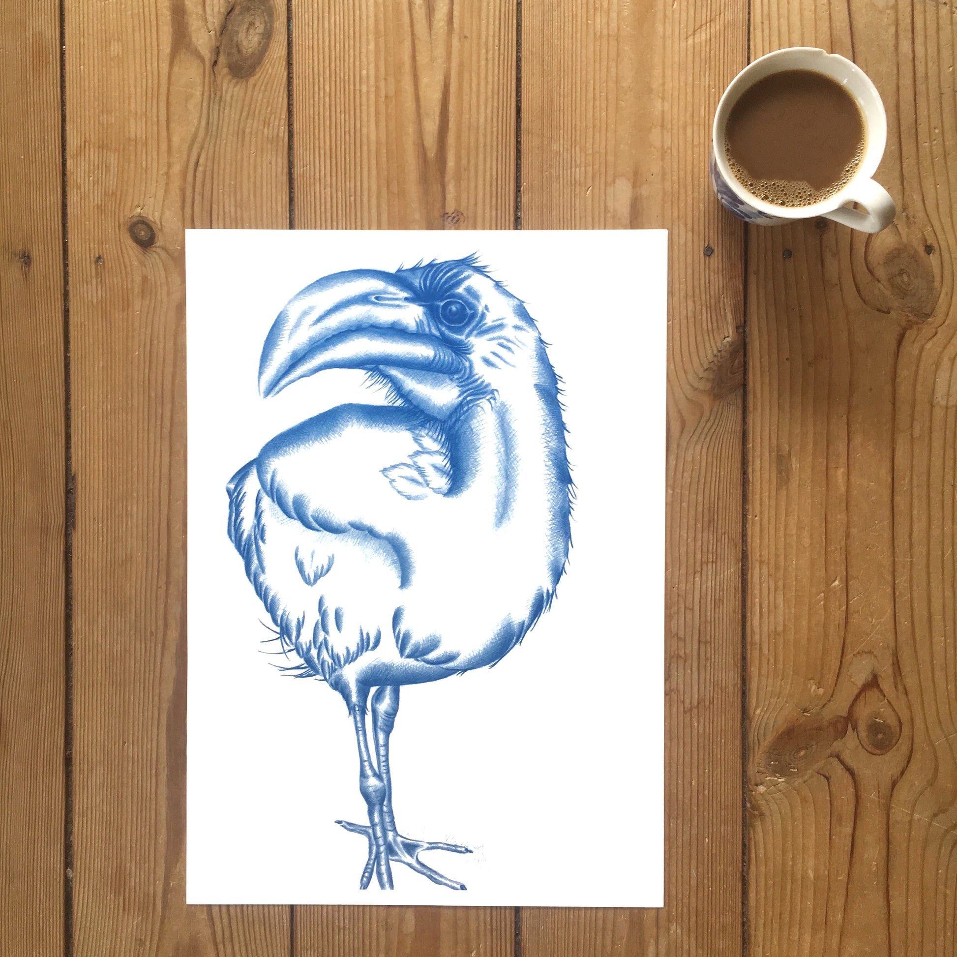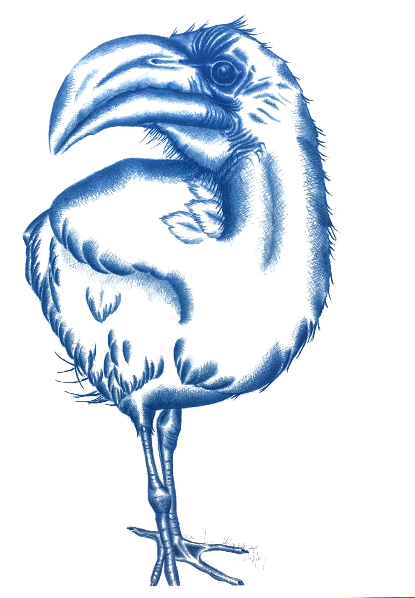 A3 tryk af Næsehornsfugl & Ibis tegnet med blå farveblyant.