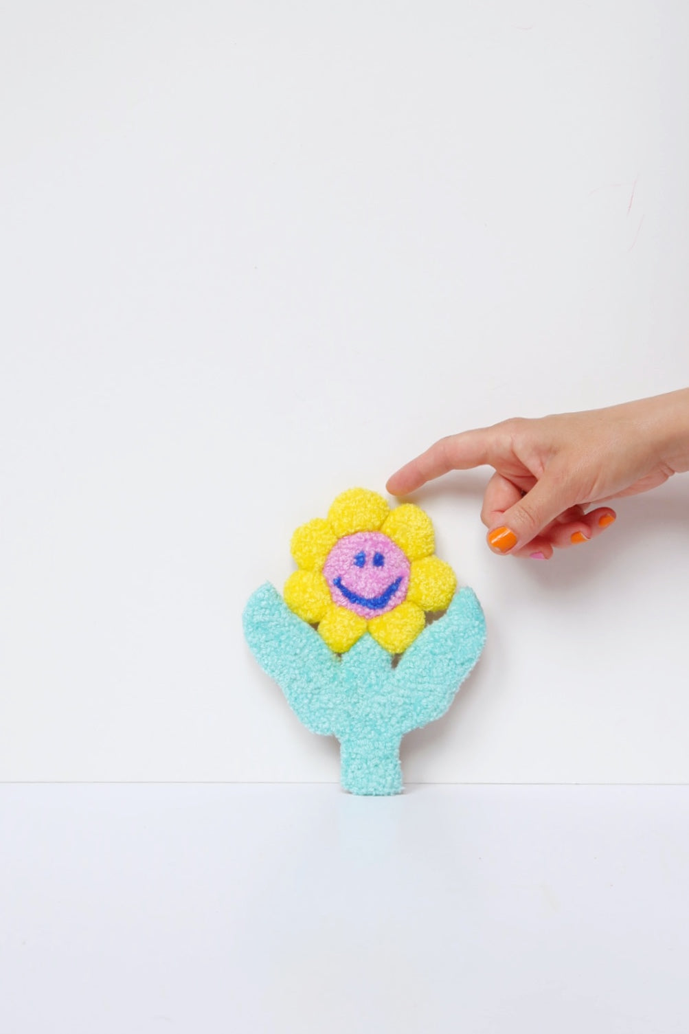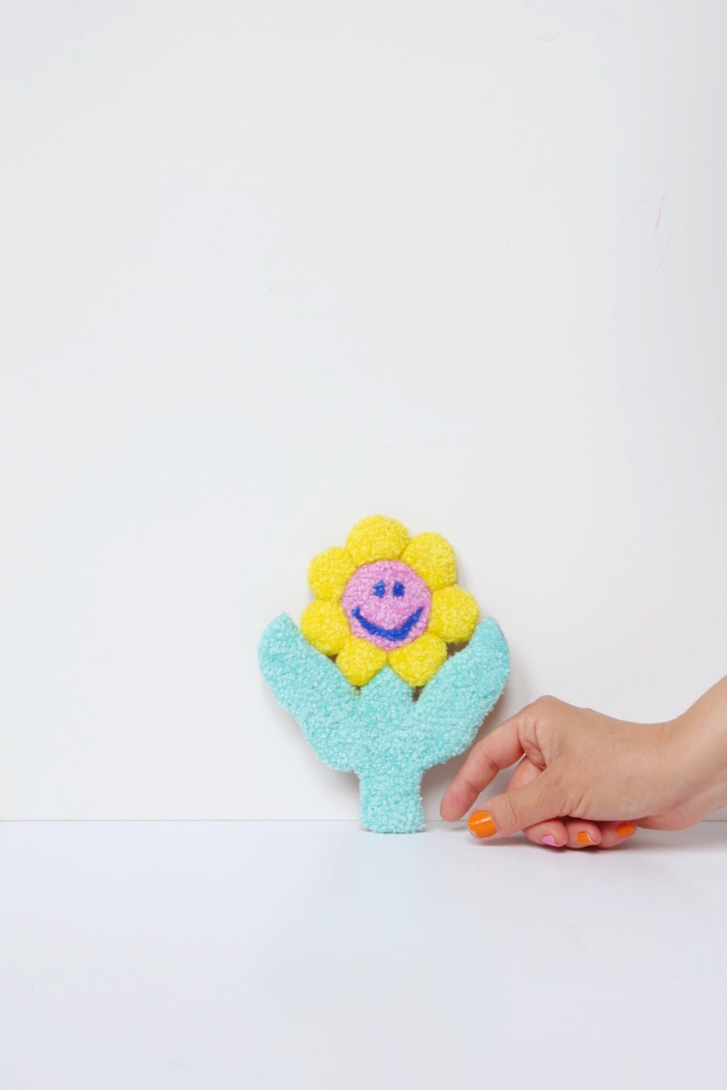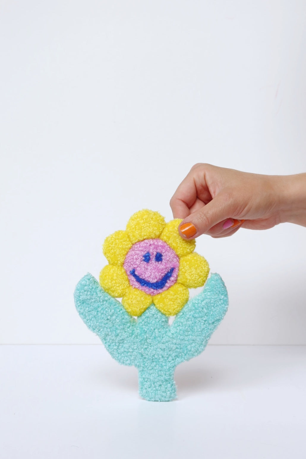 Denne glade håndlavede blomst med smiley face i gul, lyserød og lyseblå er et glædesspredende kunstværk der garanteret får alle til at smile tilbage. Med sit venlige smiley ansigt spreder den positiv energi og gode vibes.