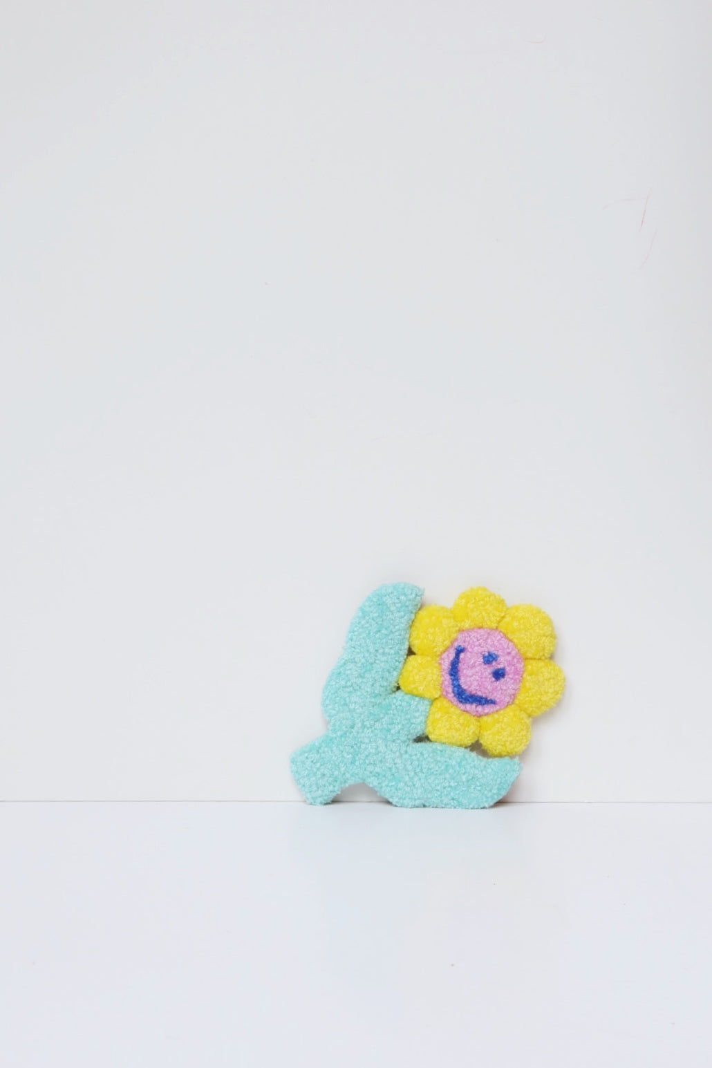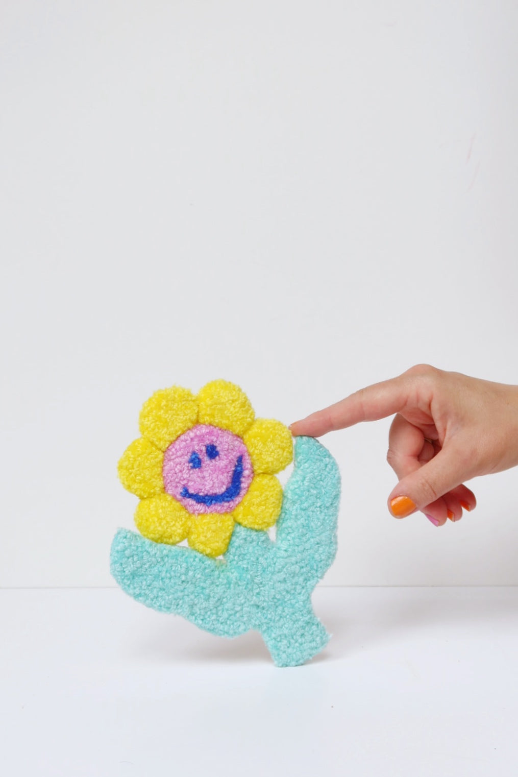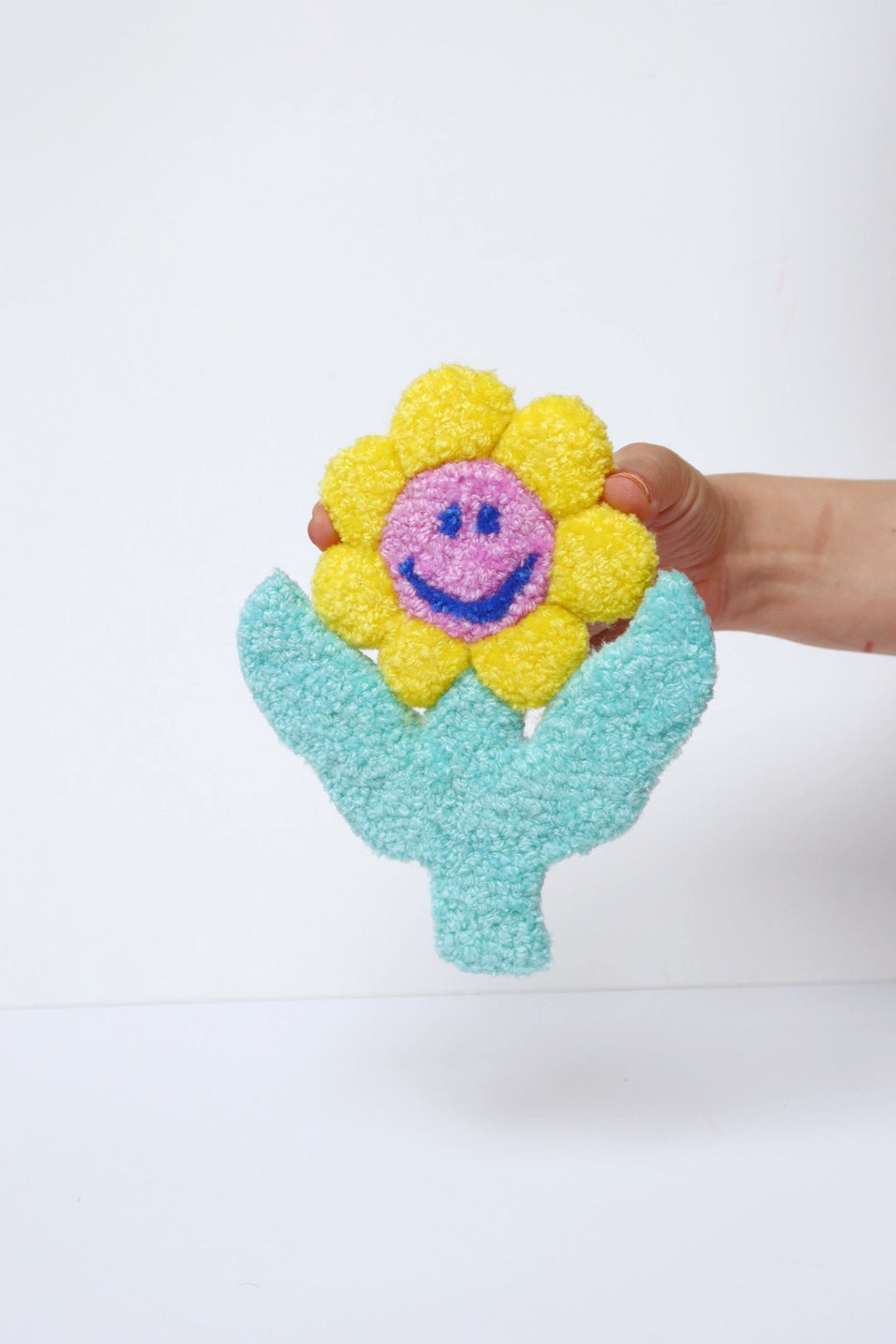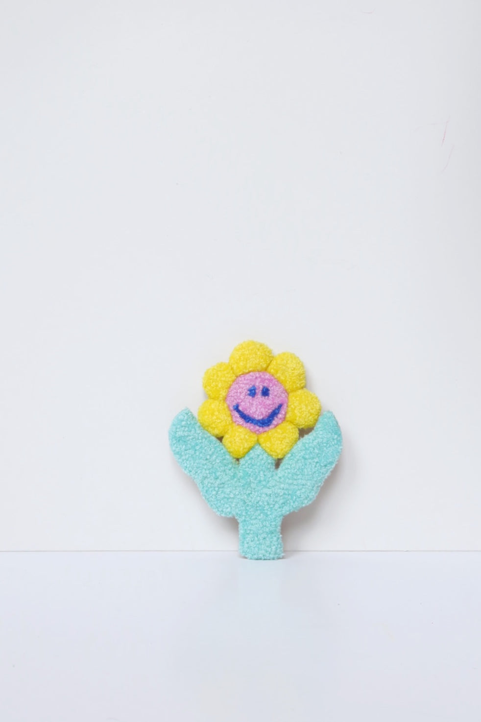 Denne glade håndlavede blomst med smiley face i gul, lyserød og lyseblå er et glædesspredende kunstværk der garanteret får alle til at smile tilbage. Med sit venlige smiley ansigt spreder den positiv energi og gode vibes.