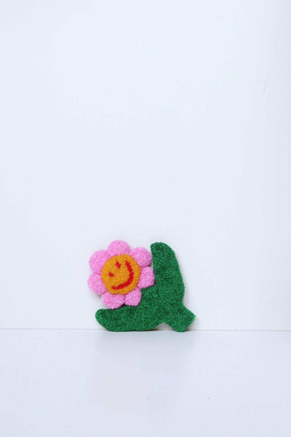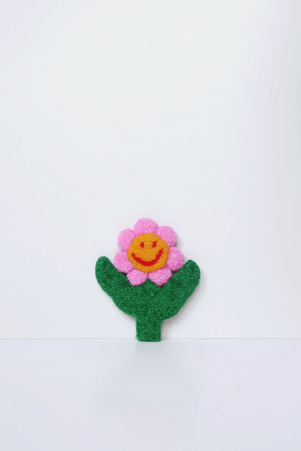 Denne glade håndlavede blomst med smiley face i pink, gul og lyserød er et glædesspredende kunstværk der garanteret får alle til at smile tilbage. Med sit venlige smiley ansigt spreder den positiv energi og gode vibes.