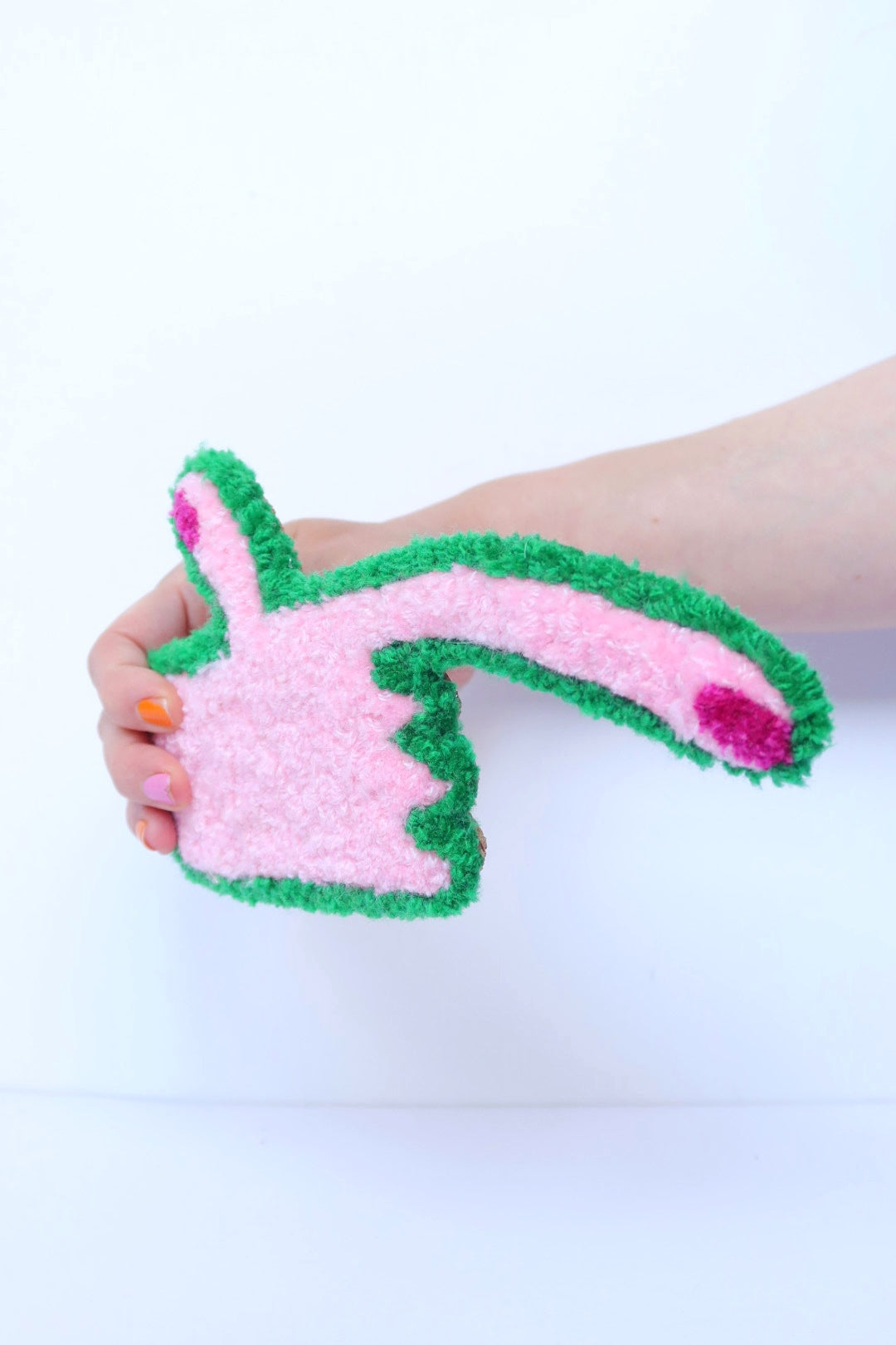Denne håndlavede softgun i light pink og grøn er et legende og humoristisk kunstværk der garanteret får folk til at smile. Med sin bløde tekstilkonstruktion er den helt uskadelig og fungerer som en sjov kunstnerisk kommentar.