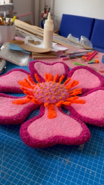 Denne store håndtuftede blomst i varme pink- og orangetoner er ikke bare kunst - den er interaktiv. Du kan forme den præcis som du vil have den, skabe din egen imponerende blomst i lyserød, mørk pink og orange der bliver et statement i dit hjem.