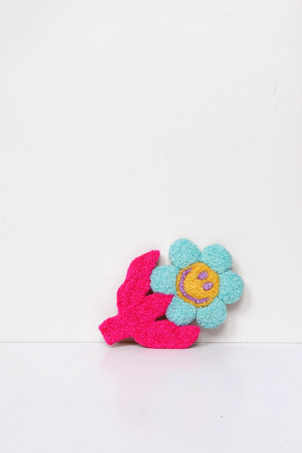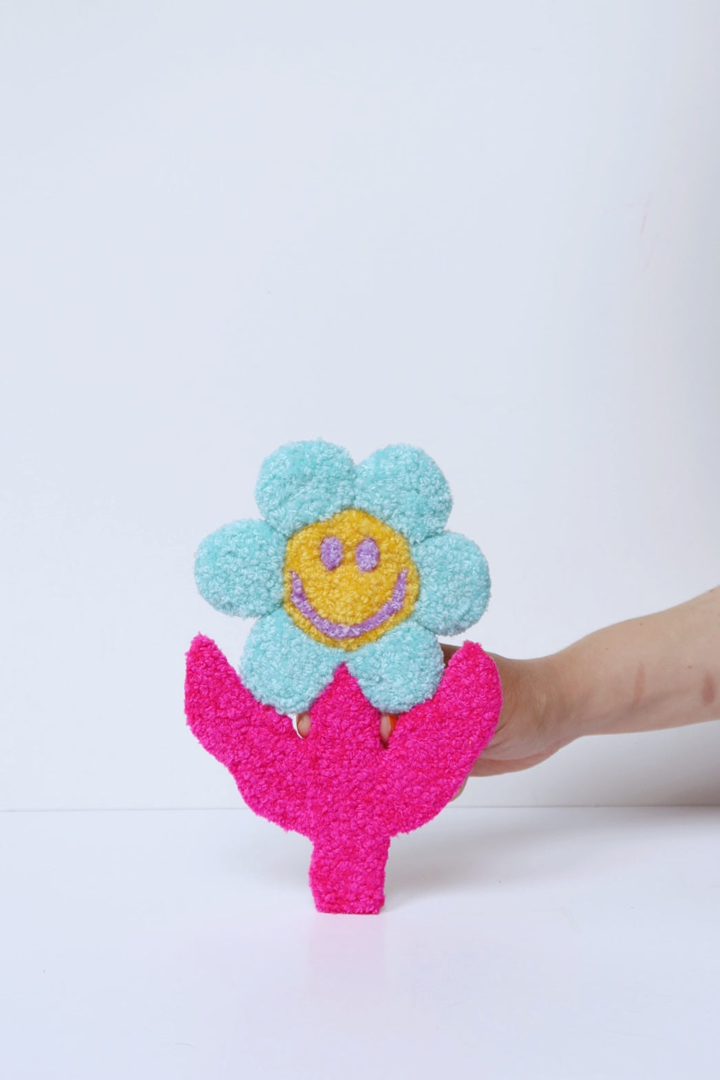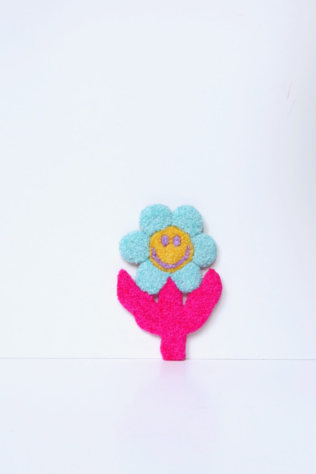 Denne store, glade håndlavede blomst med smiley face i lyseblå, gul og pink er et glædesspredende kunstværk der garanteret får alle til at smile tilbage. Med sit venlige smiley ansigt spreder den positiv energi og gode vibes.