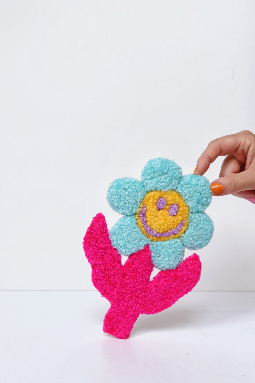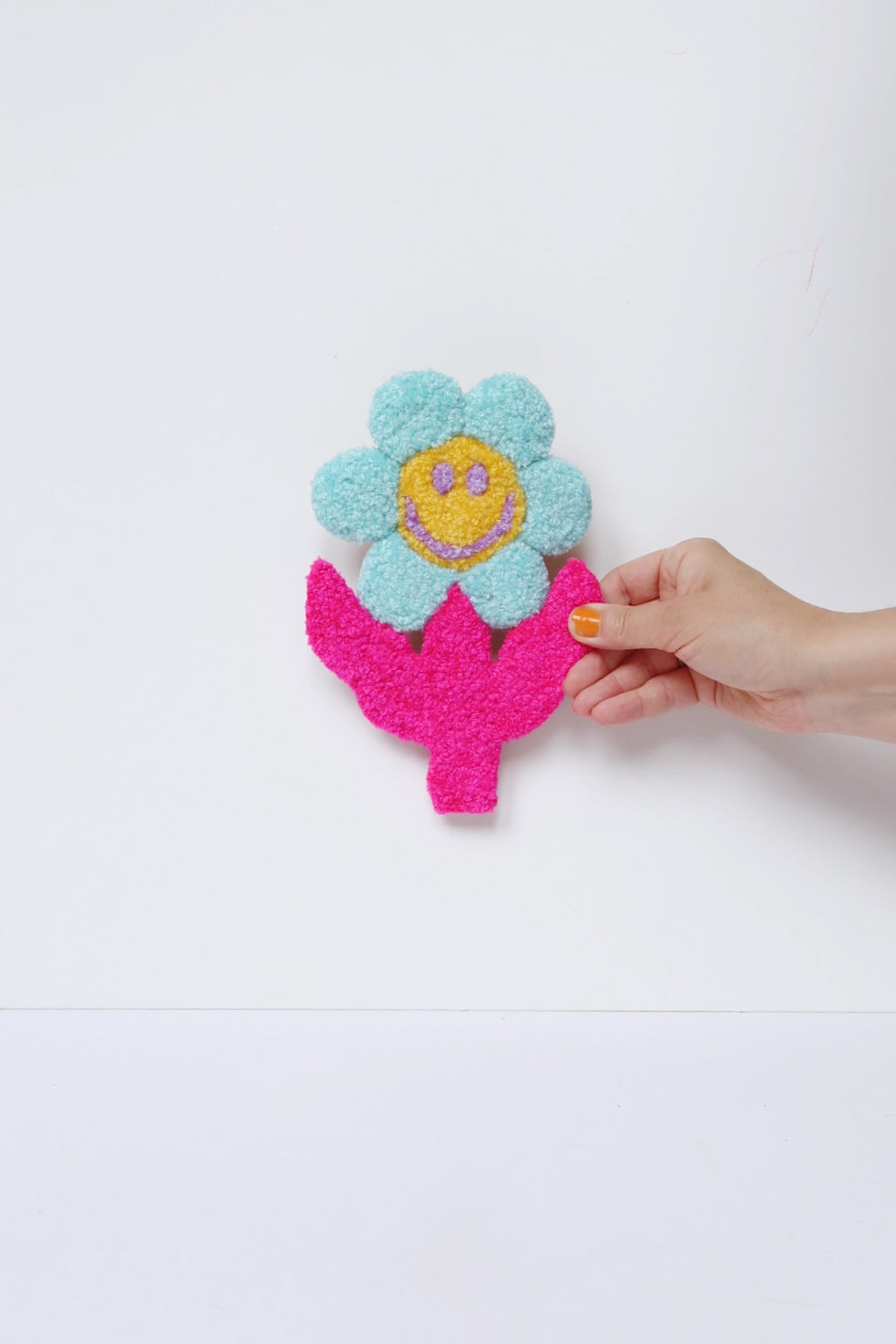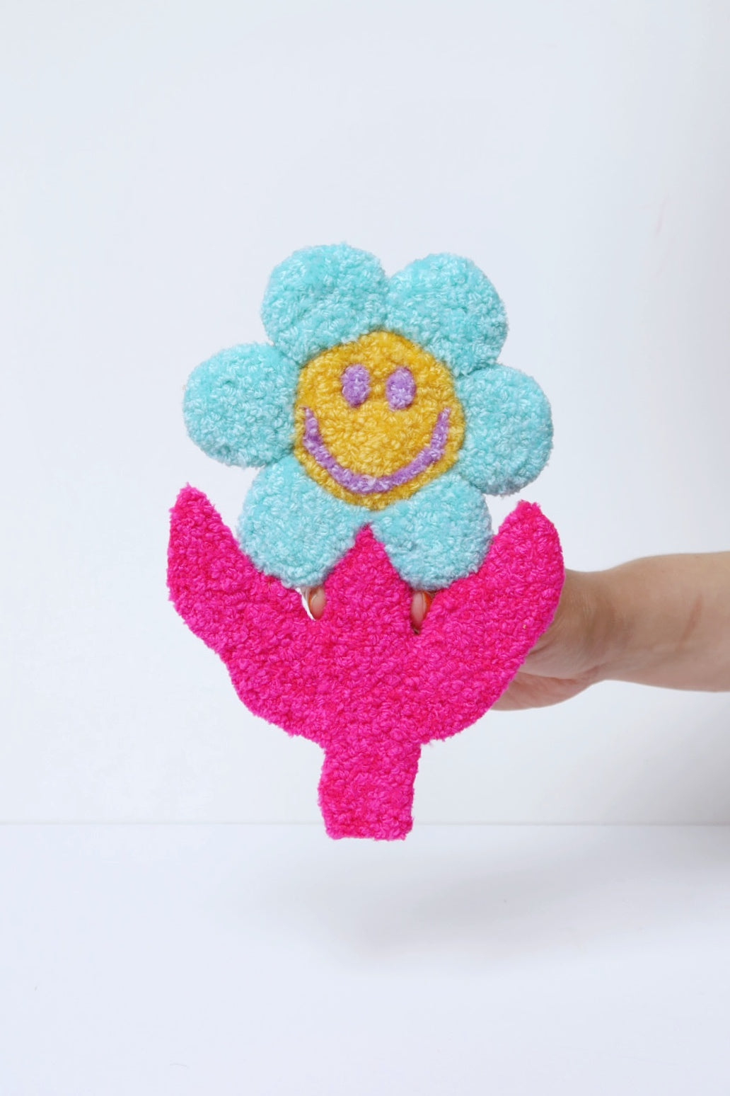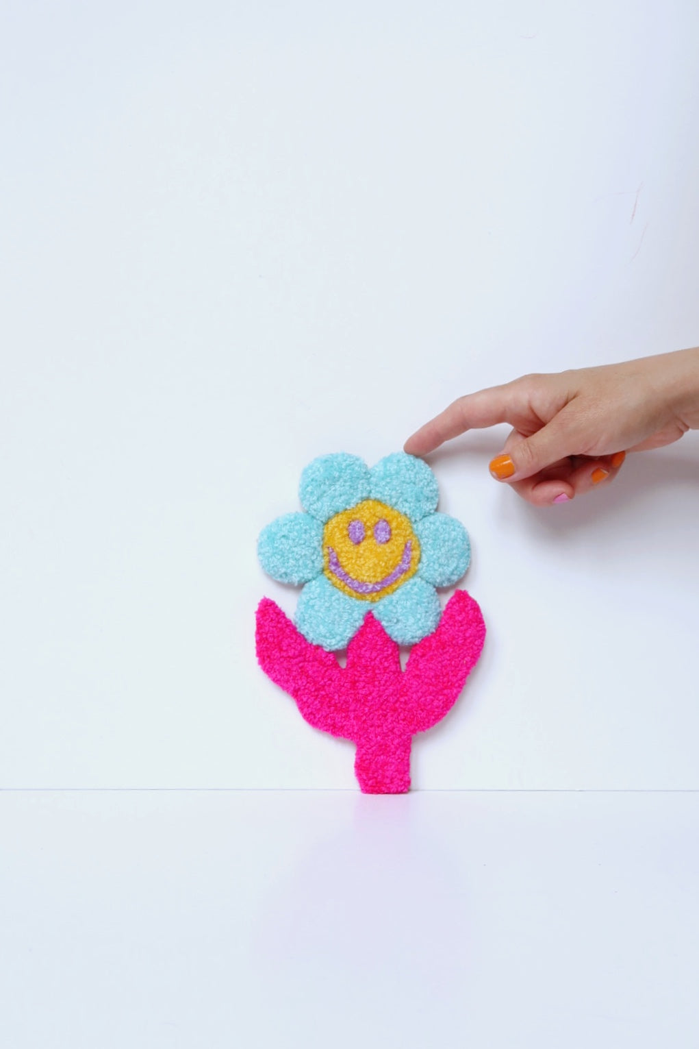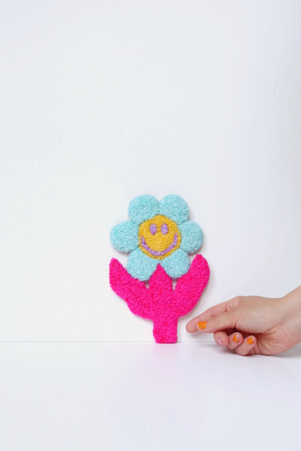 😊 Stor Smiley Face Blomst - Lyseblå, Gul & Pink Tekstilkunst