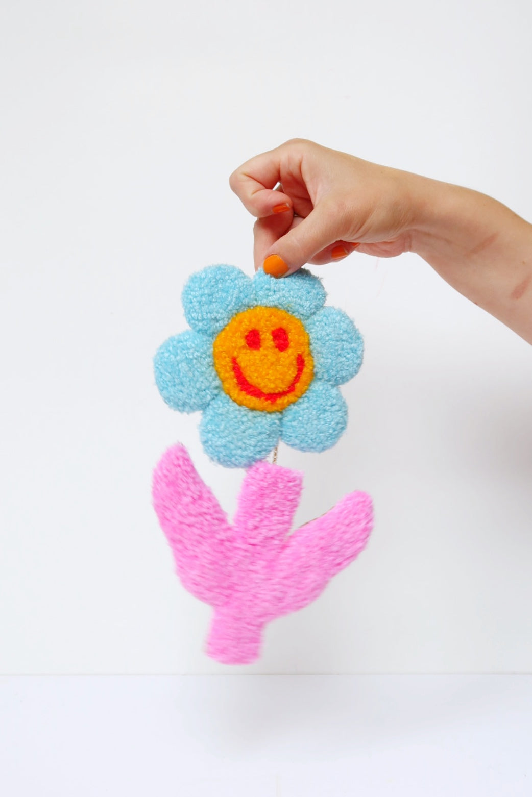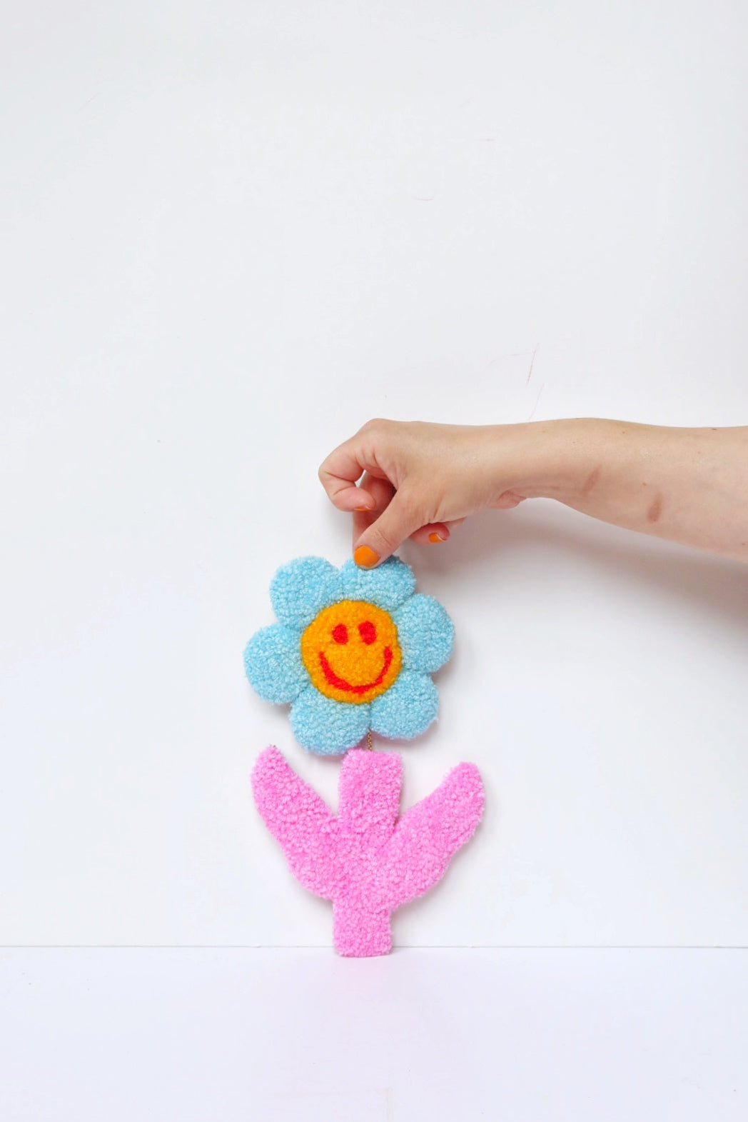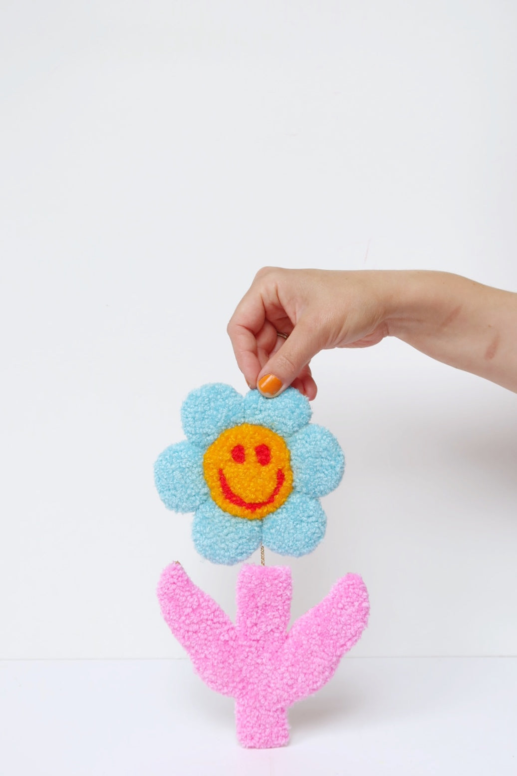 😊 Stor Smiley Face Blomst - Lyseblå, Gul & Pink Tekstilkunst