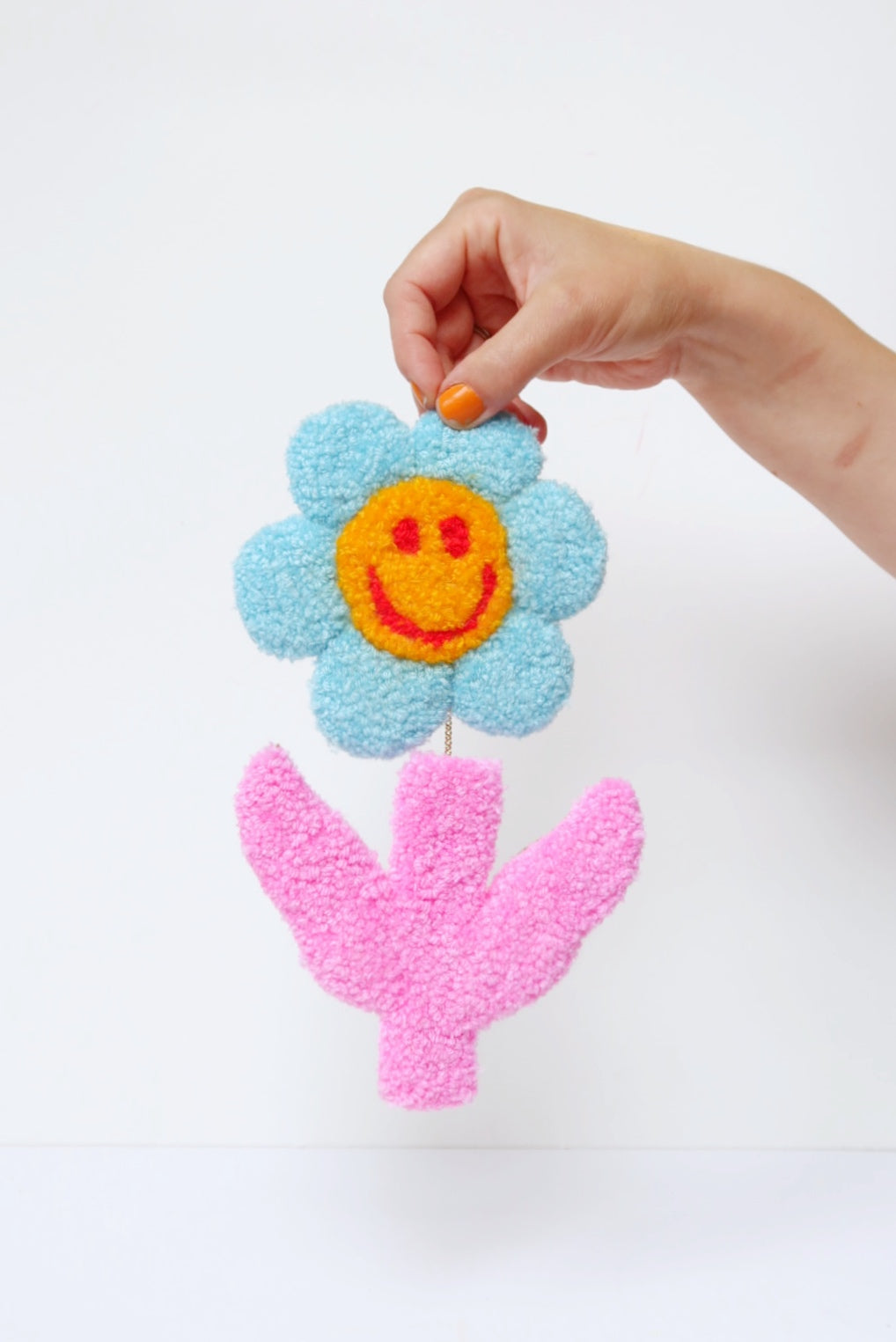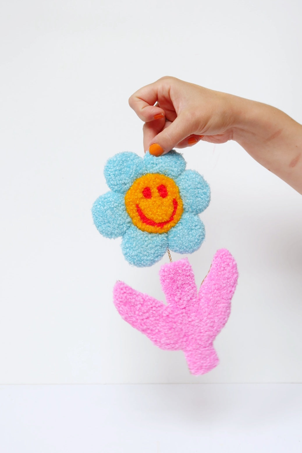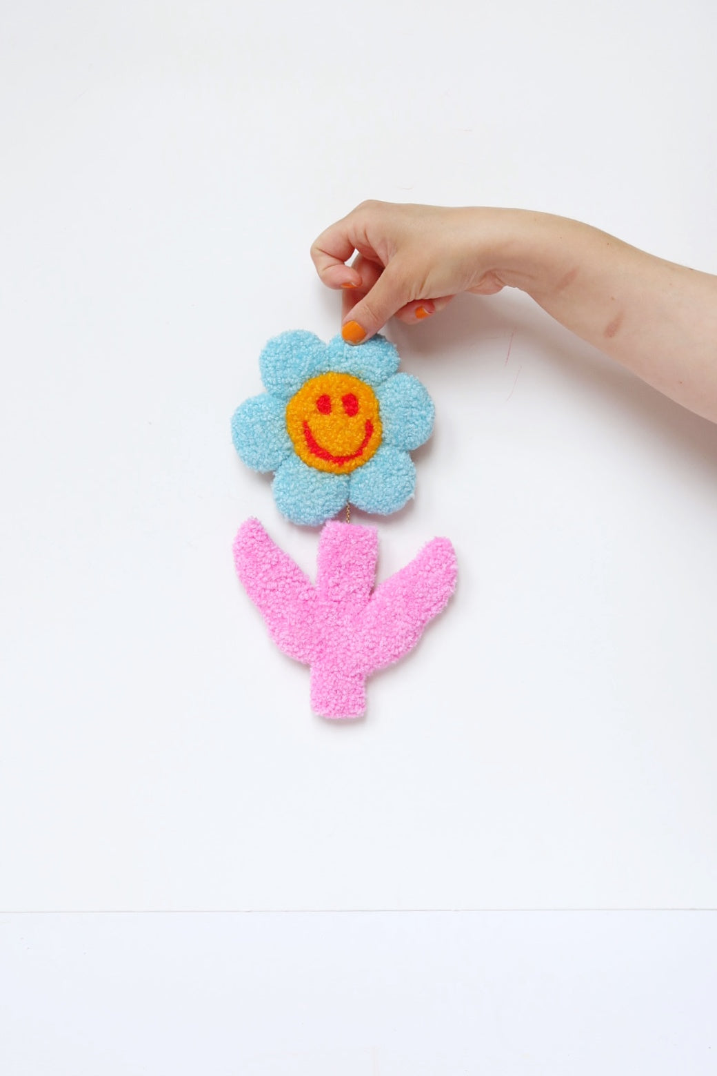 😊 Stor Smiley Face Blomst - Lyseblå, Gul & Pink Tekstilkunst