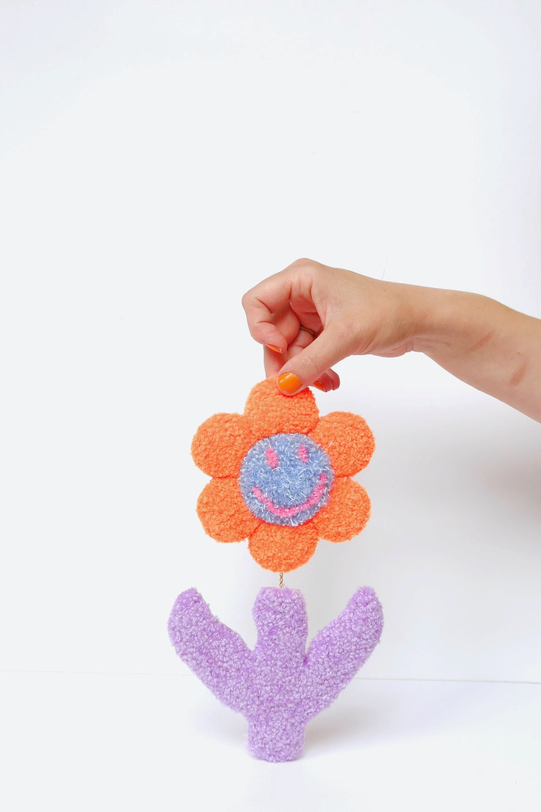 Denne store, glade håndlavede blomst med smiley face i orange, lyseblå og syren er et glædesspredende kunstværk der garanteret får alle til at smile tilbage. Med sit venlige smiley ansigt spreder den positiv energi og gode vibes.